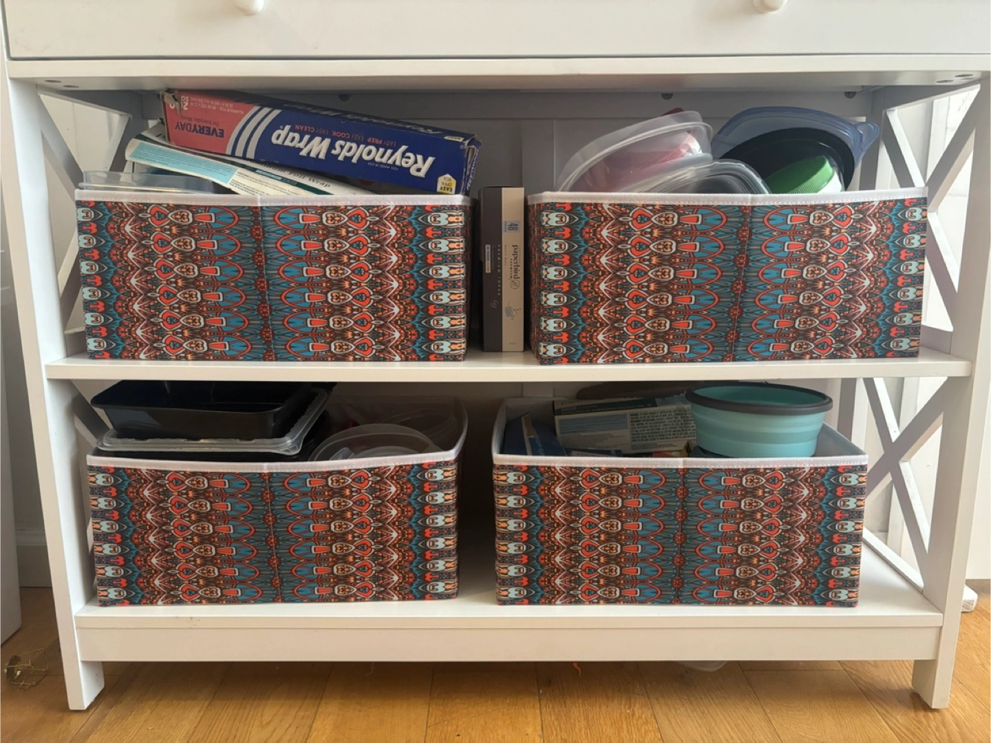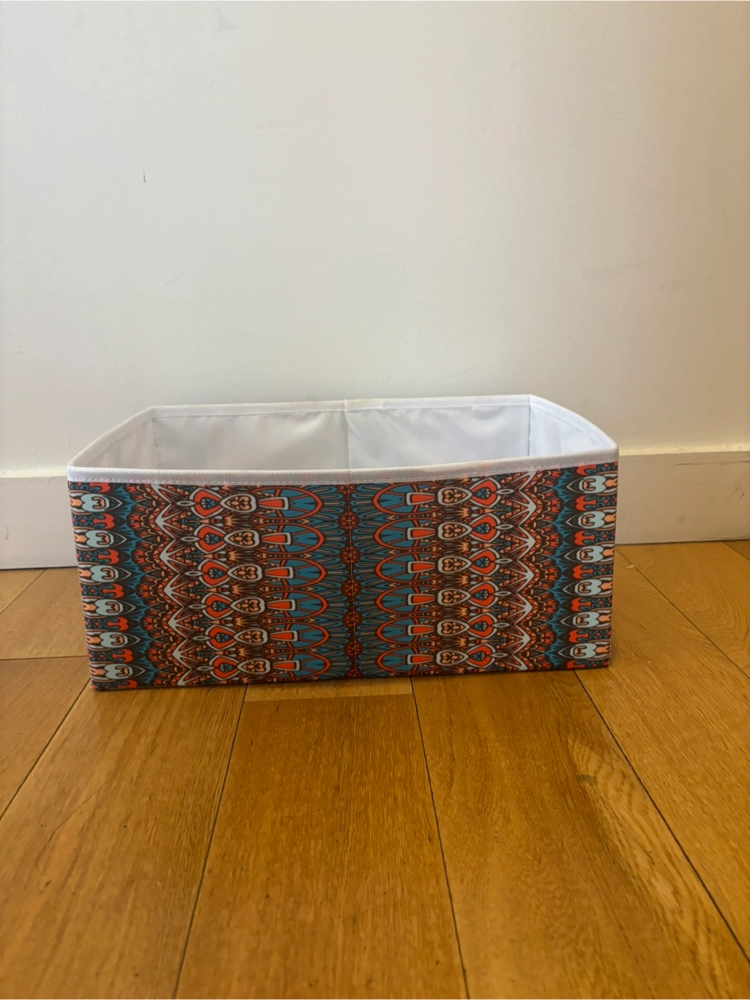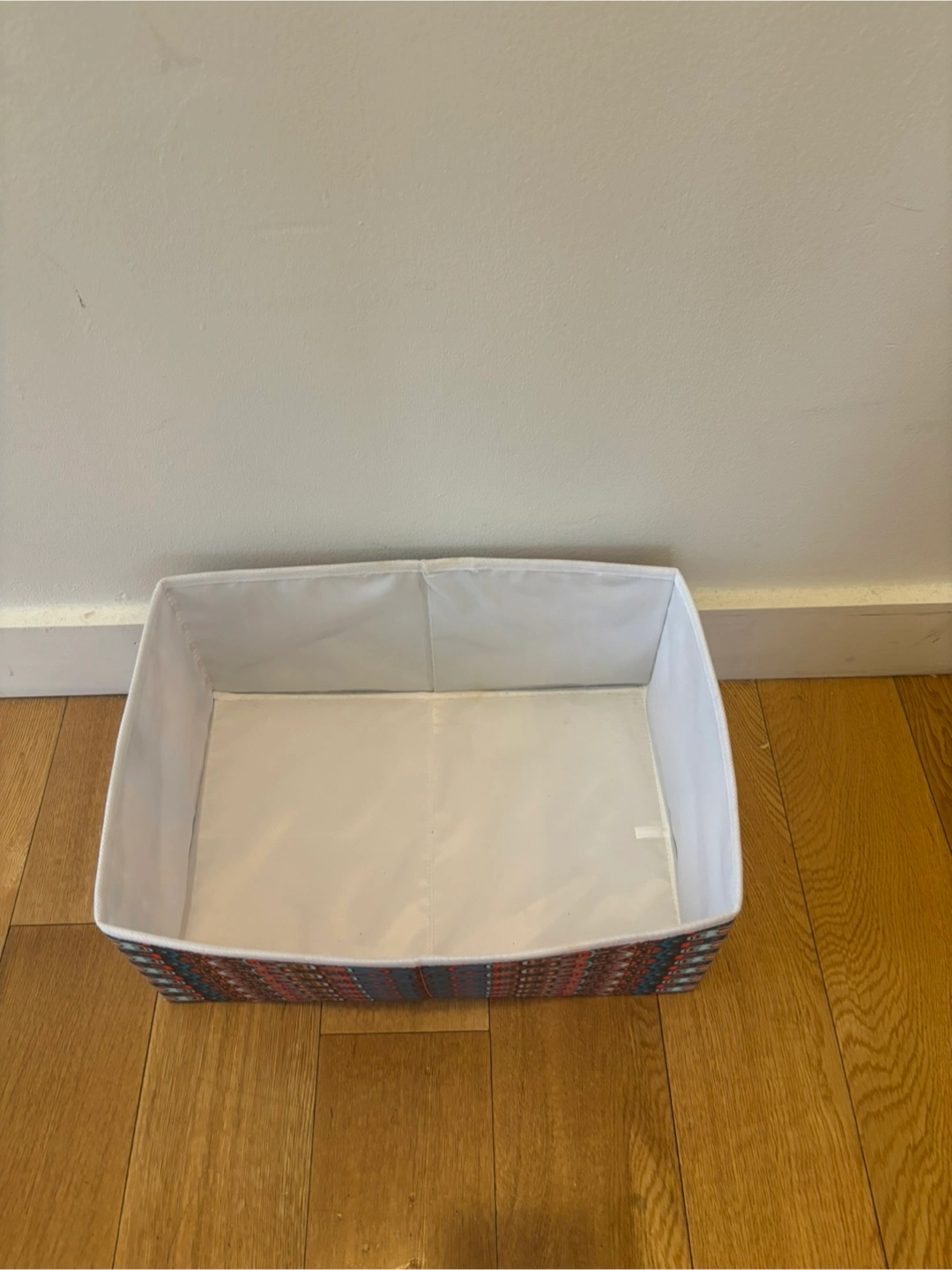 Here are four patterned fabric storage boxes that are perfect for organizing your shelves or drawers! It's in great condition and ready to help you tidy up your space. Will sell them for 5 dollars each or 15 for all 4!