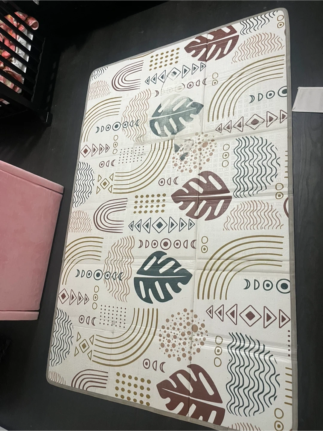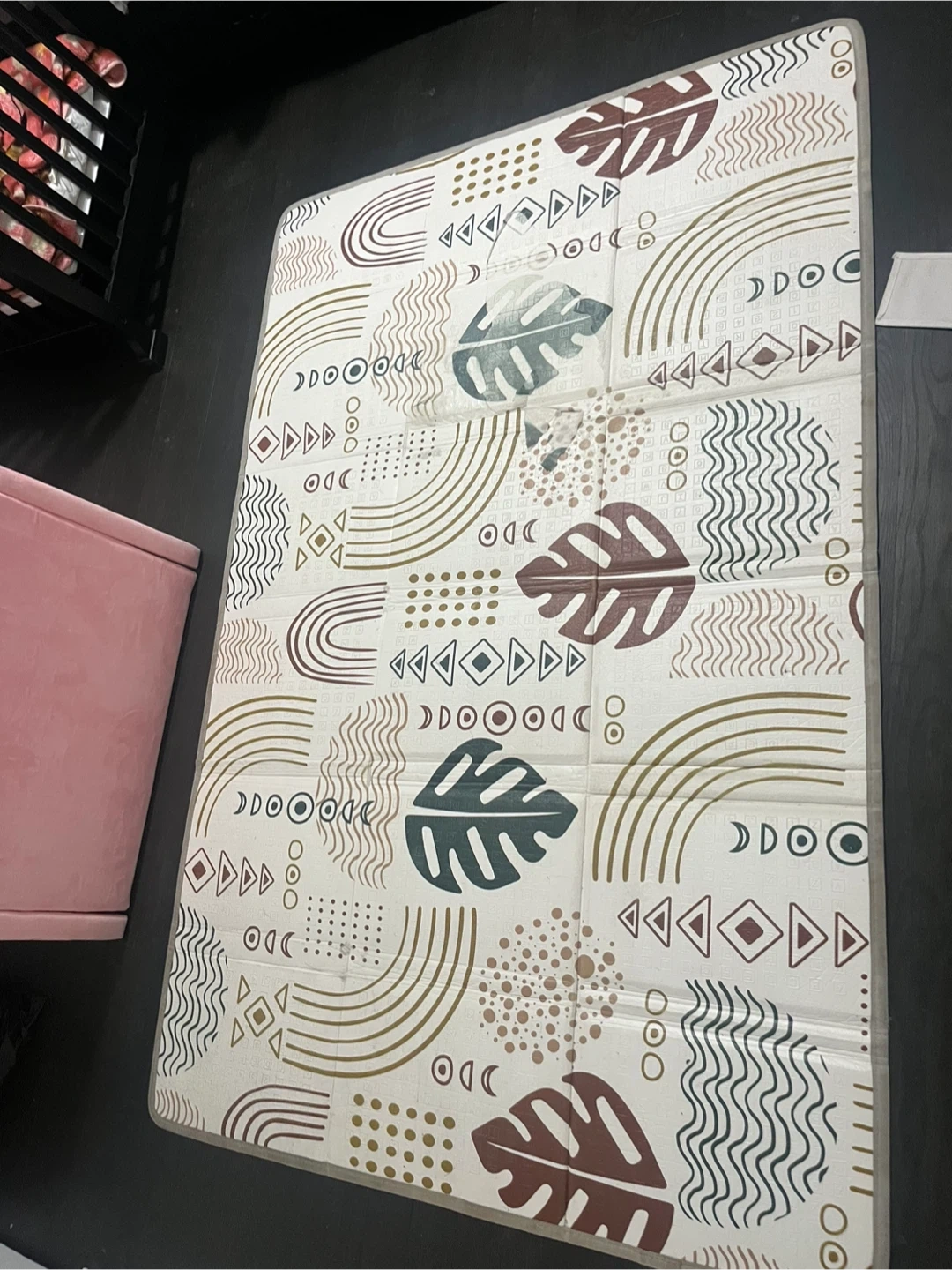 Here's a folding play mat with a fun pattern! It's perfect for kids to play on and easy to fold up for storage when not in use. The mat is in good condition and ready for a new home
