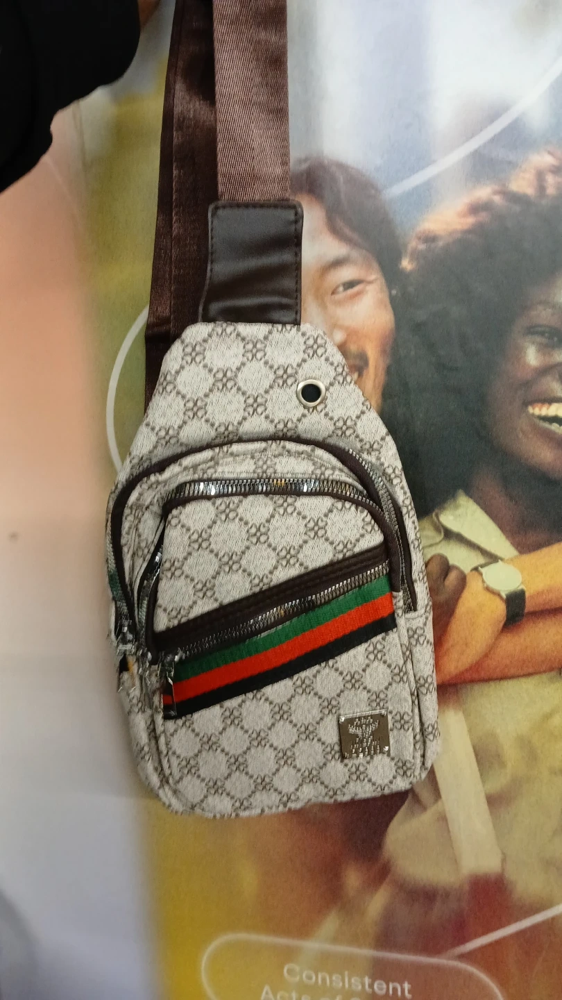 5Here's a stylish sling bag with a unique patterned design! It features a brown shoulder strap and a sporty stripe detail in green and red. Perfect for adding a touch of flair to your everyday look