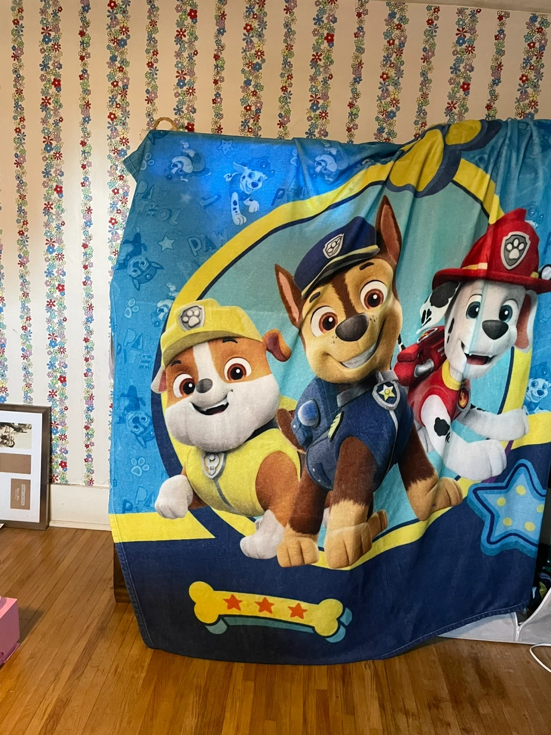 Snuggle up with this Paw Patrol throw blanket! It features Chase, Marshall, and Rubble on a blue background. Perfect for any Paw Patrol fan