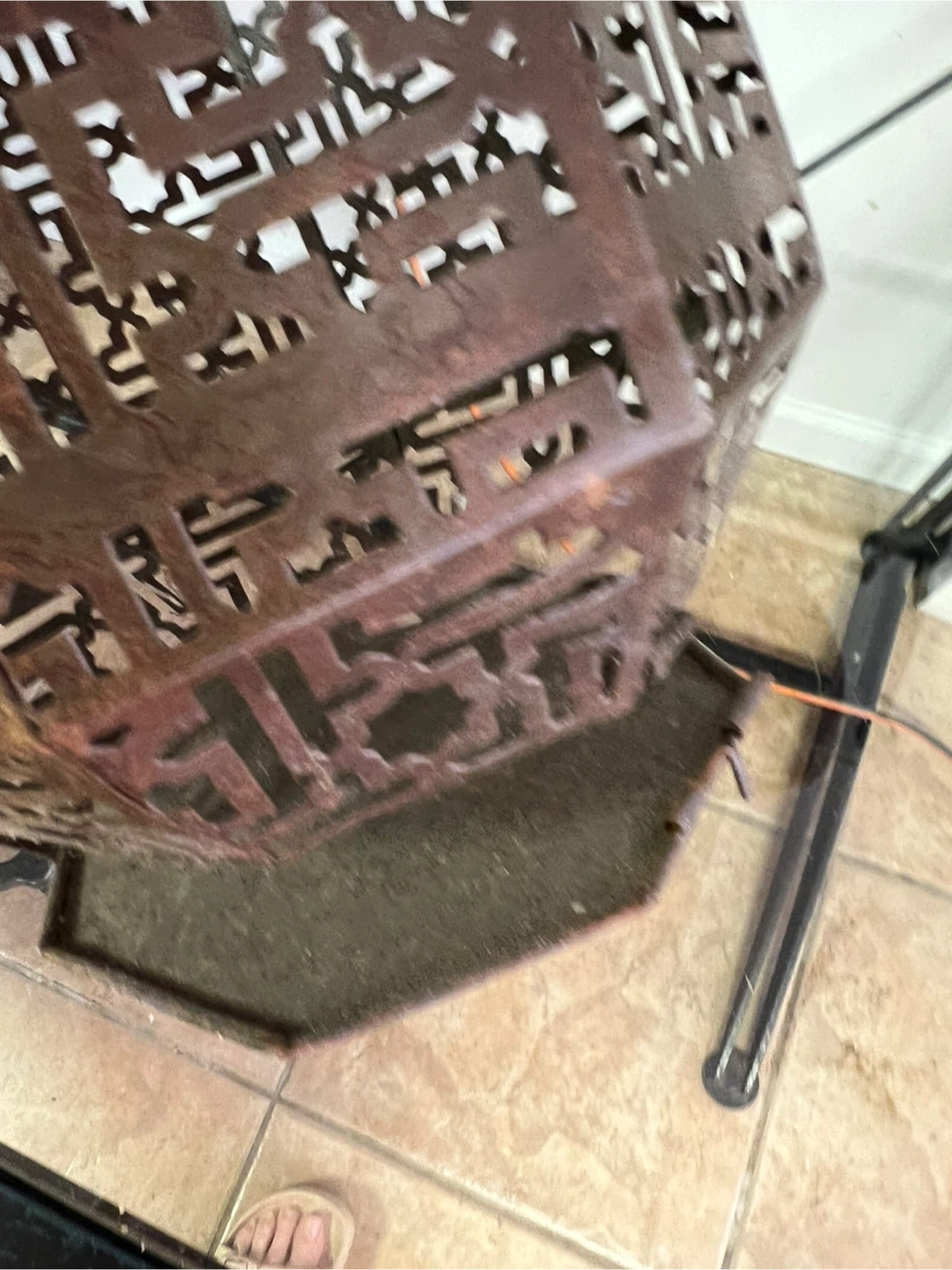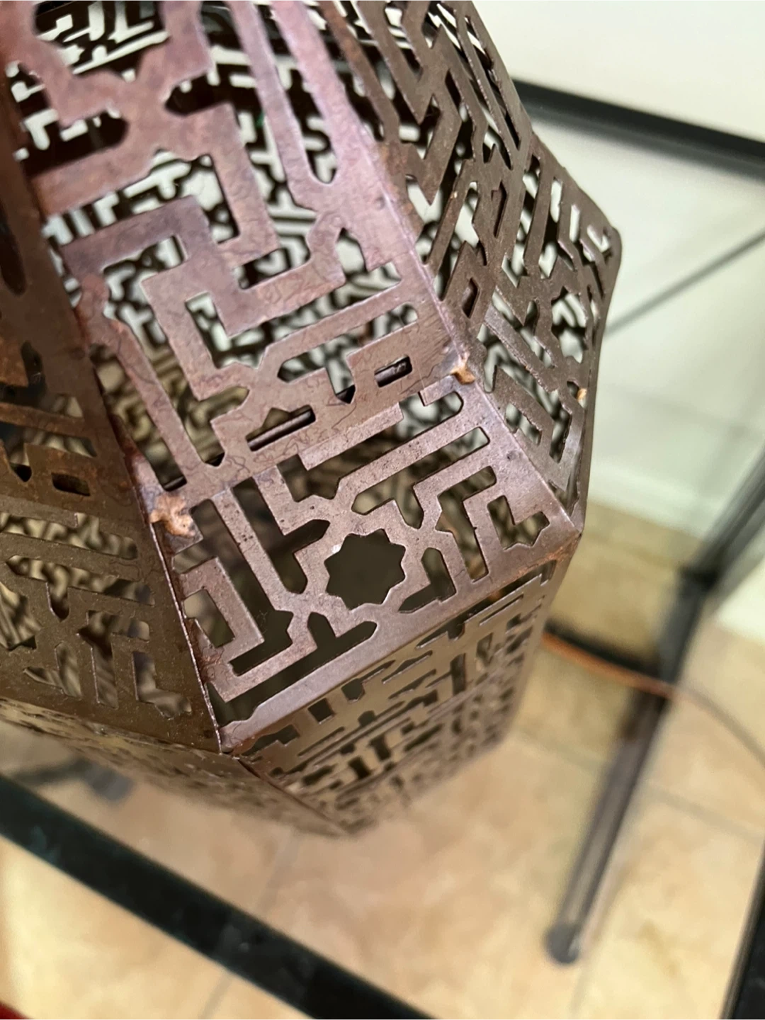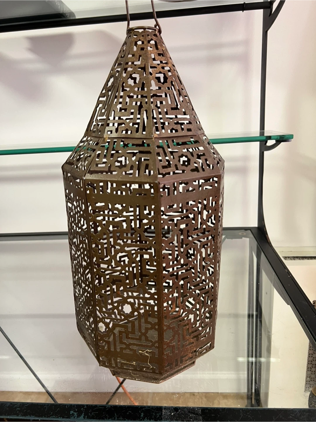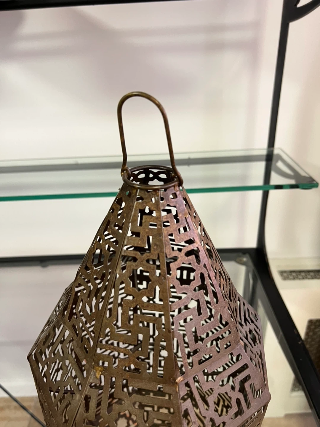 This is a decorative lantern from Urban Outfitters. It's made of metal with an intricate, geometric cut-out pattern. The lantern is designed for decorative purposes and originates from India. It has a unique, artistic style!