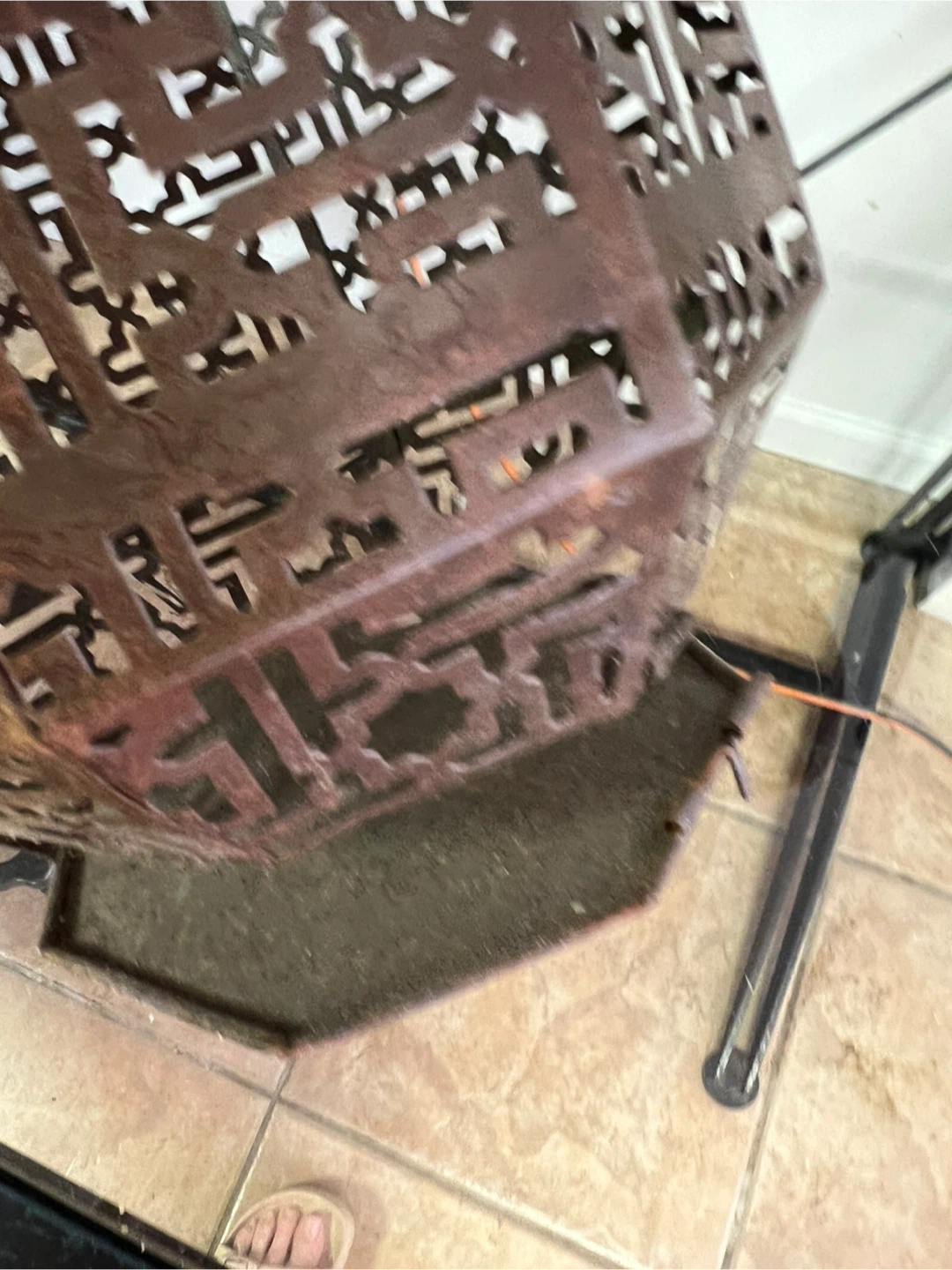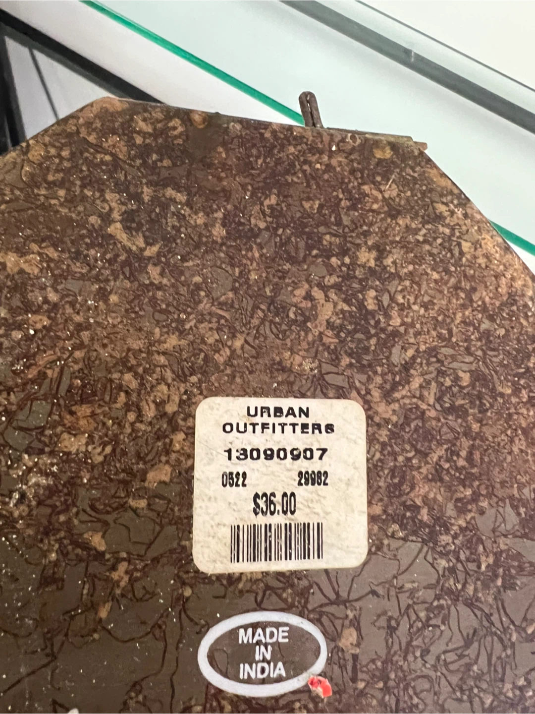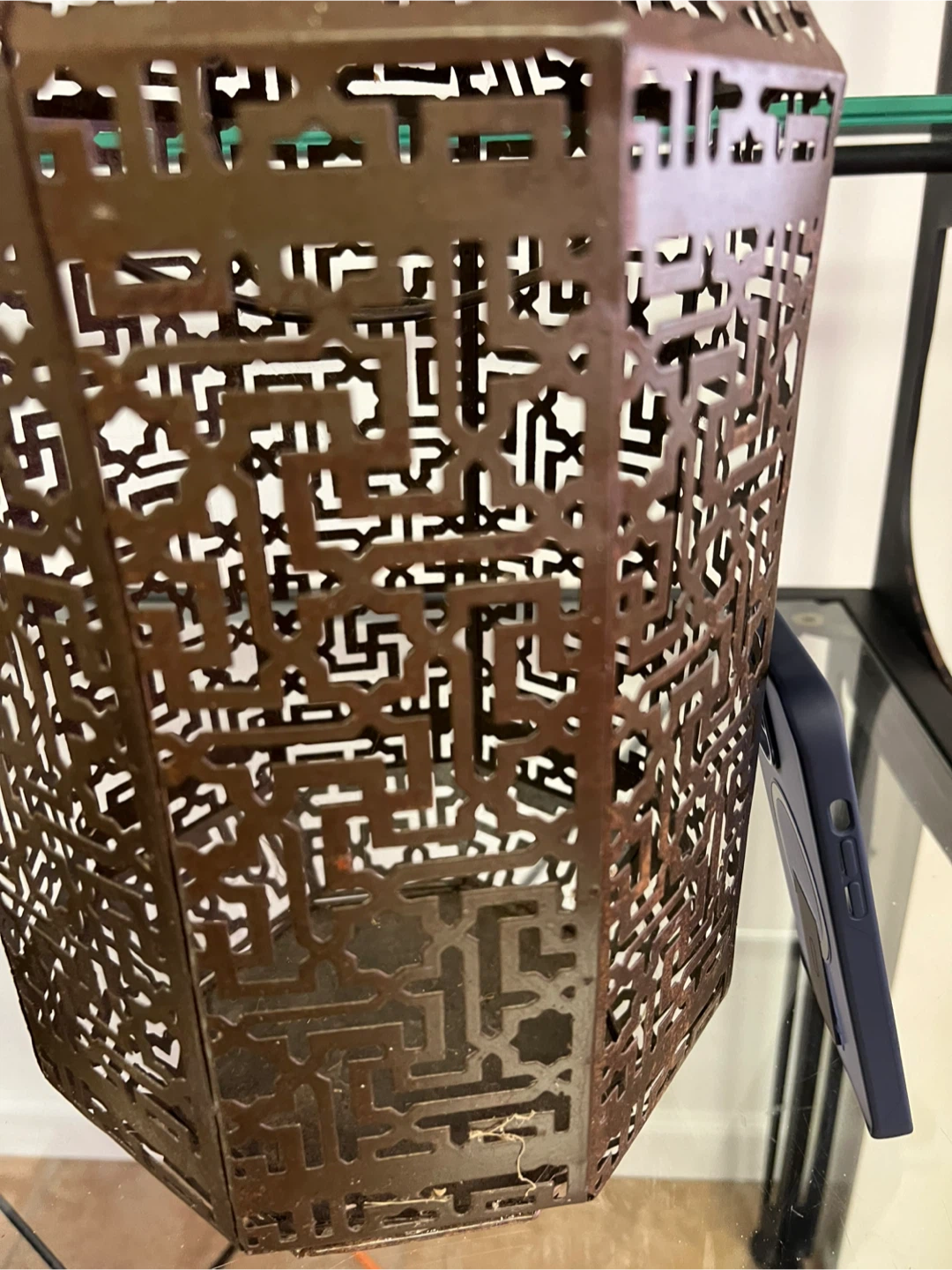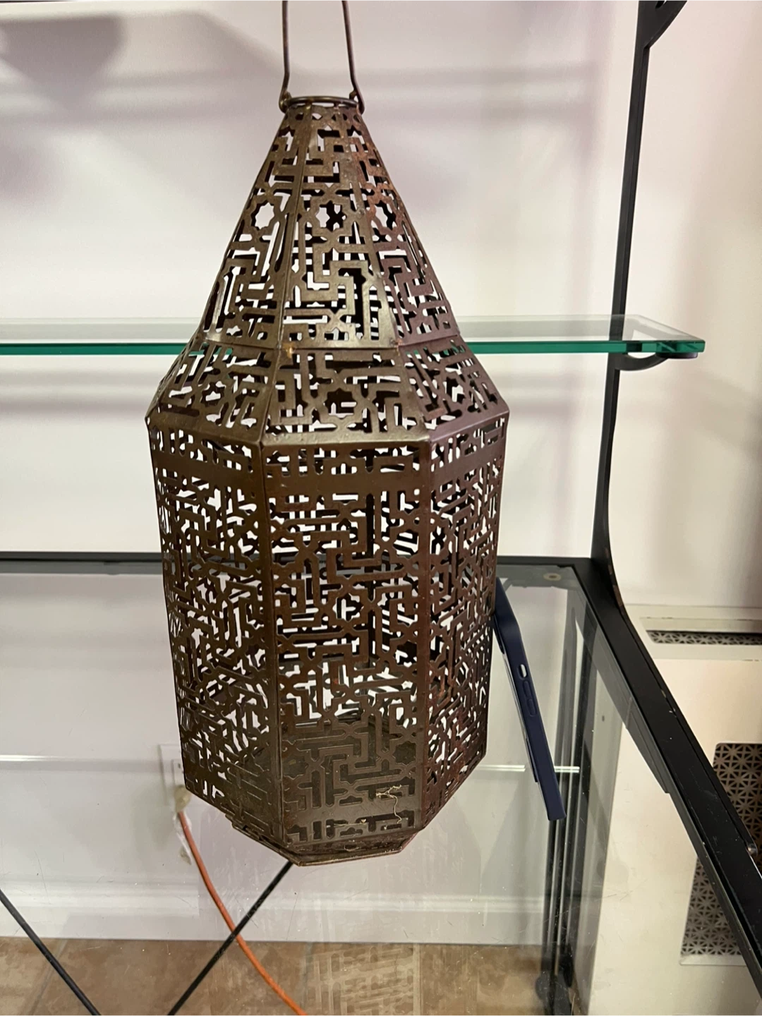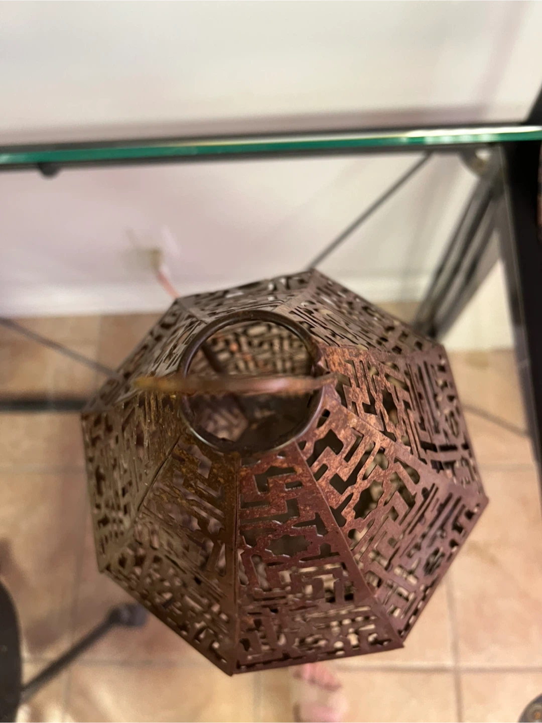 This is a decorative lantern from Urban Outfitters. It's made of metal with an intricate, geometric cut-out pattern. The lantern is designed for decorative purposes and originates from India. It has a unique, artistic style!