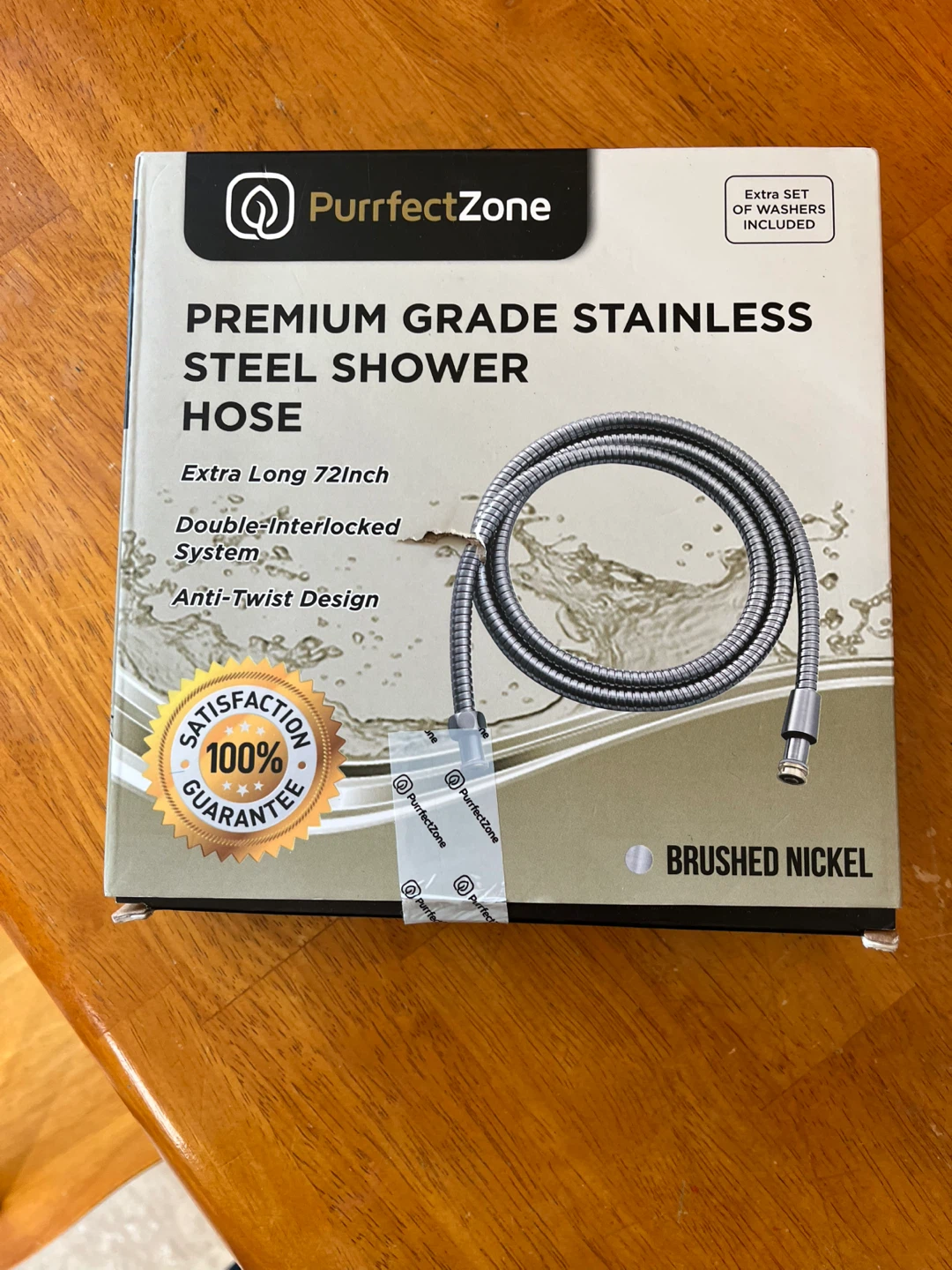 Selling a PurrfectZone premium grade stainless steel shower hose! It's extra long at 72 inches and features a double-interlocked system with an anti-twist design. An extra set of washers is included. The finish is a stylish brushed nickel