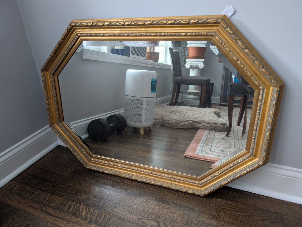 Freecycling a beautiful octagon-shaped mirror with a gold frame! It's in great condition and would look lovely in any room. The frame has a detailed design that adds a touch of elegance. I'm giving it away because I just don't have space.