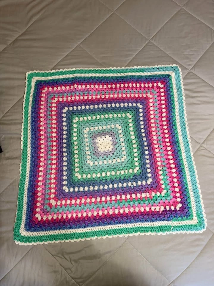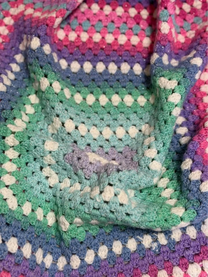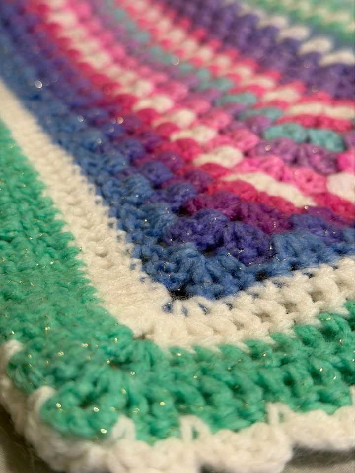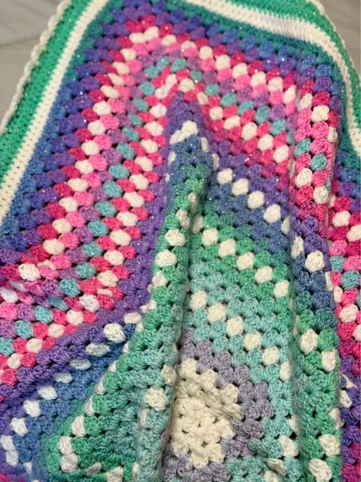 Handmade crochet blanket, Unicorn-inspired color palette, Pink, purple, aqua, blue, and white tones, Subtle sparkle throughout the yarn, Soft textured granny-square style design, Great for baby, toddler, or lap use, Beautiful baby shower or birthday gift.