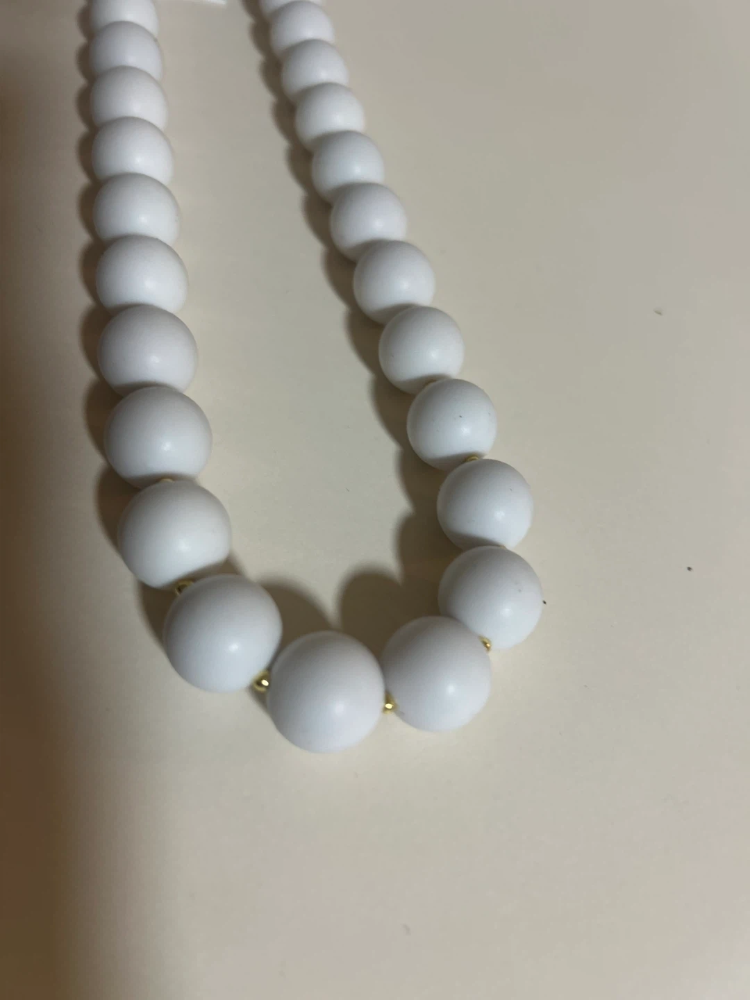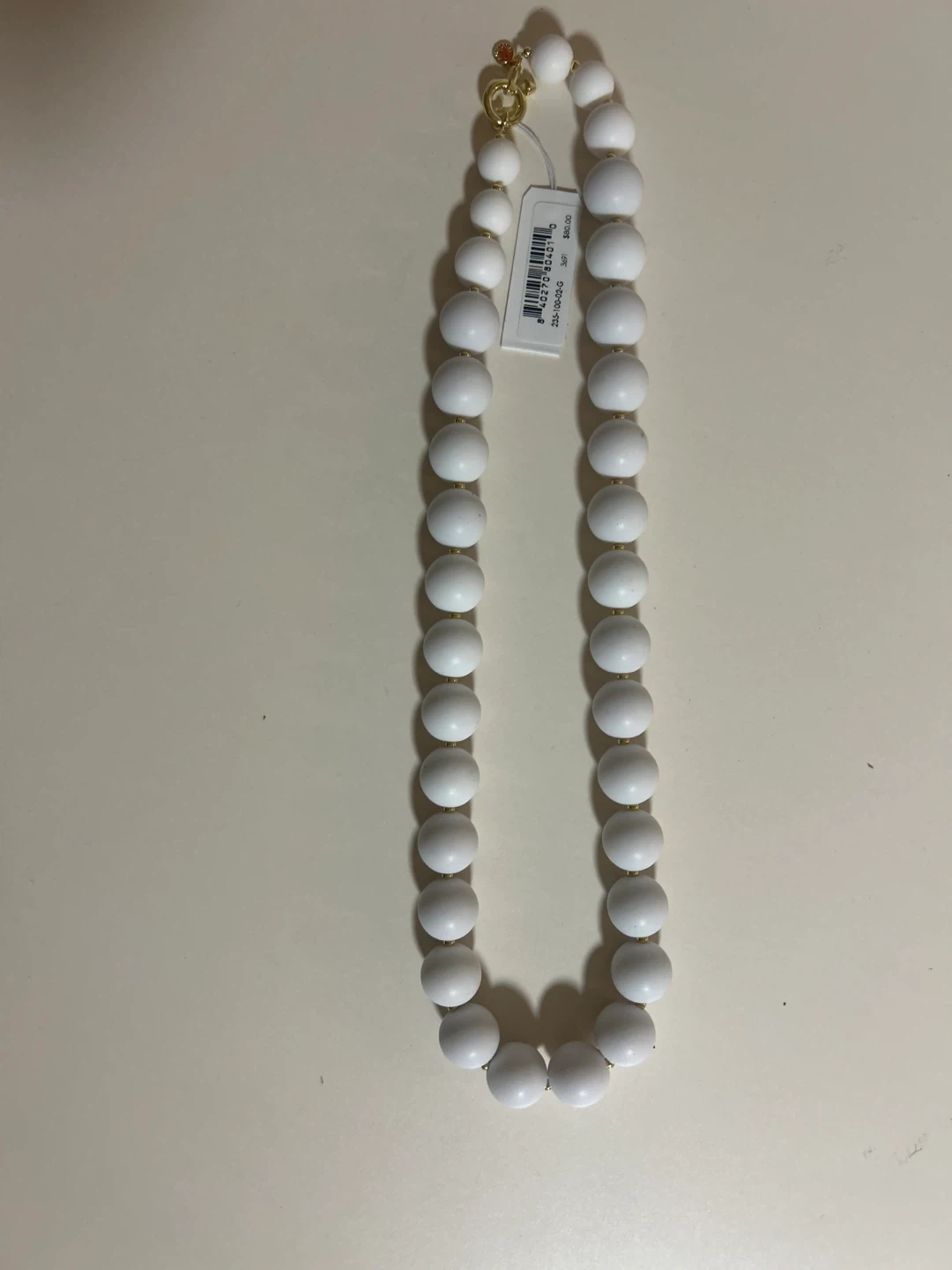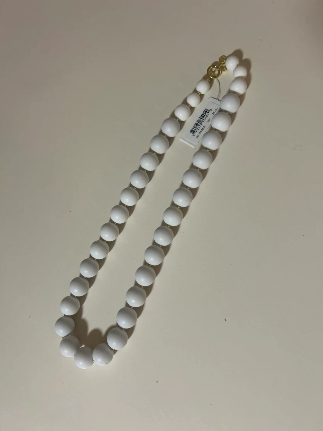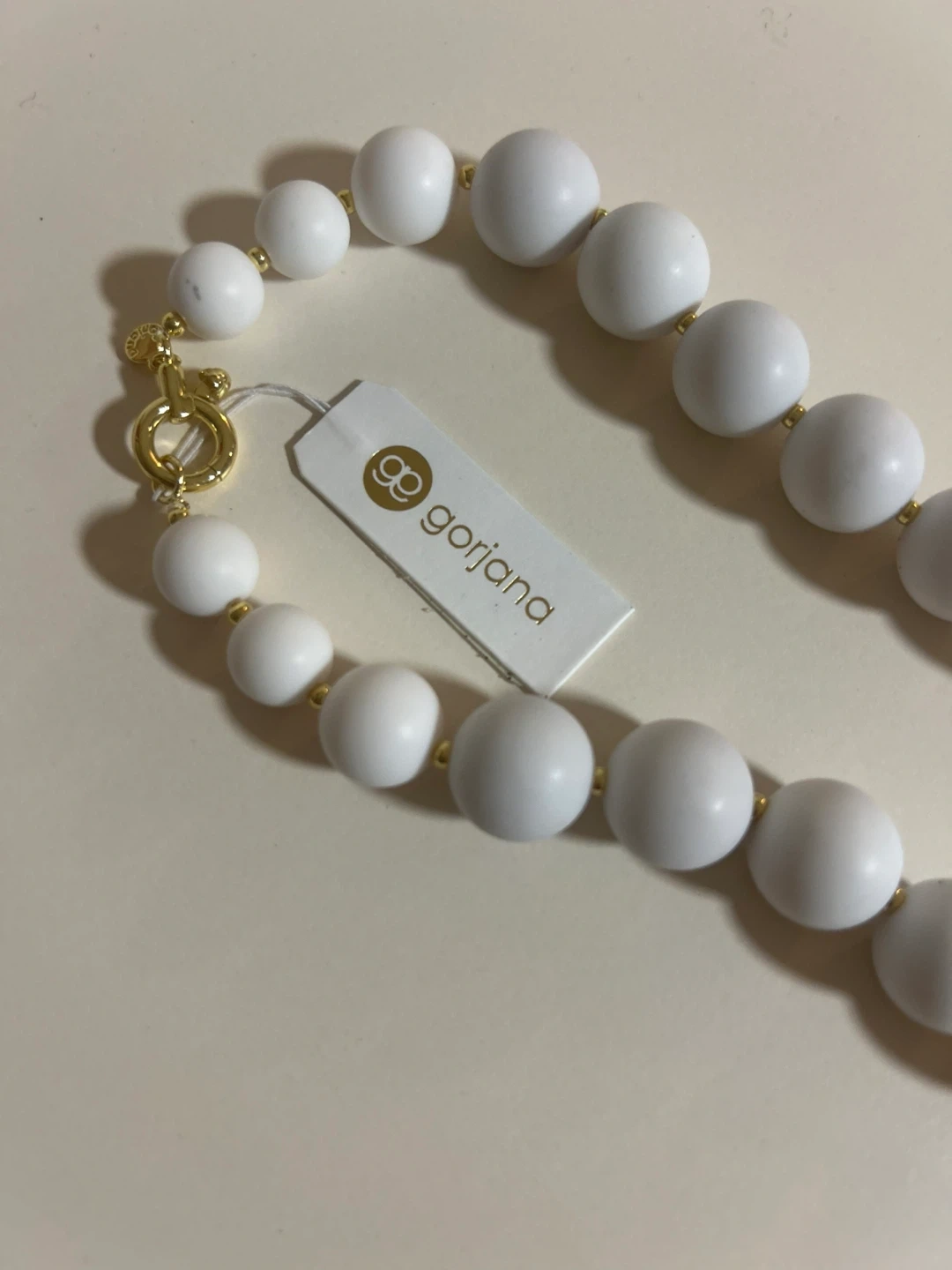 This is a Gorjana beaded necklace in white. It's brand new with the tag still attached! The tag shows it originally retailed for $80. The necklace features white beads and gold accents.