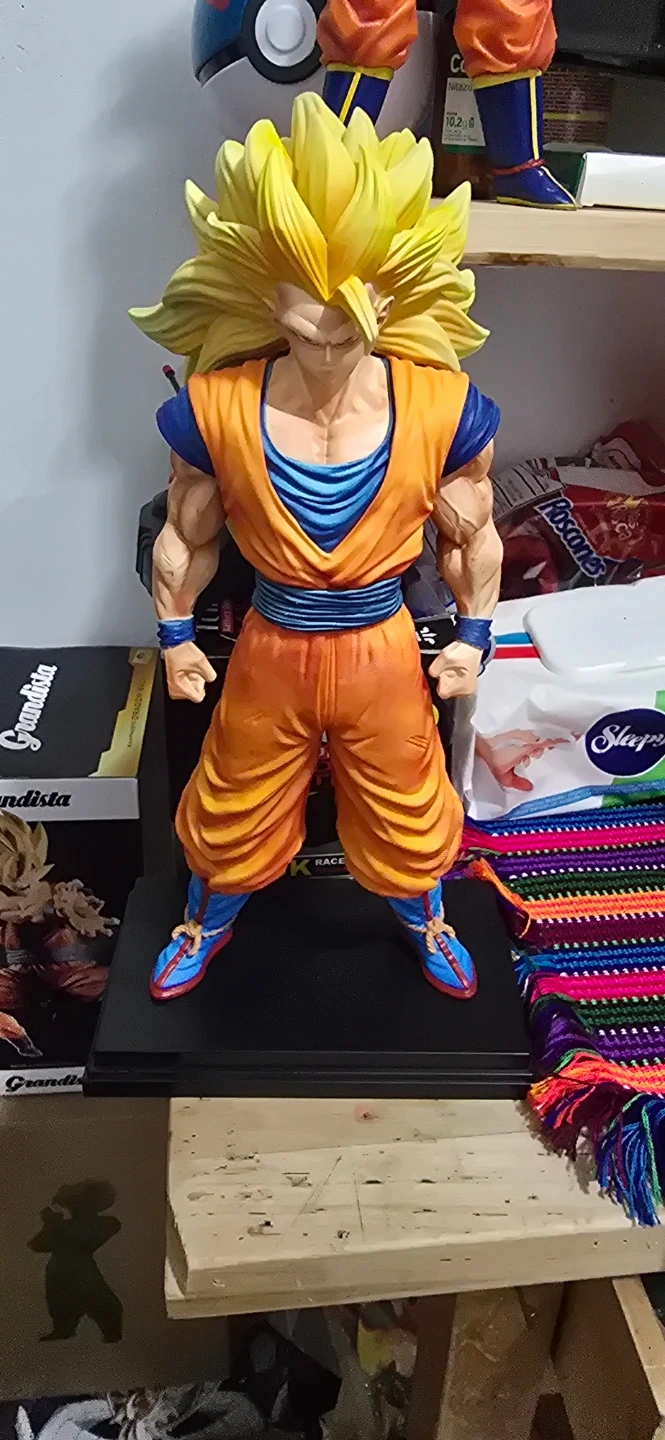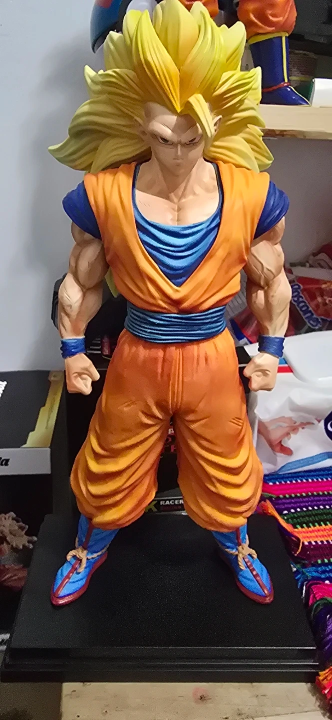This is a Dragon Ball Z figure featuring Goku in his Super Saiyan 3 form. It's approximately 10-12 inches tall and made of durable PVC material. A great collectible for fans of the series!