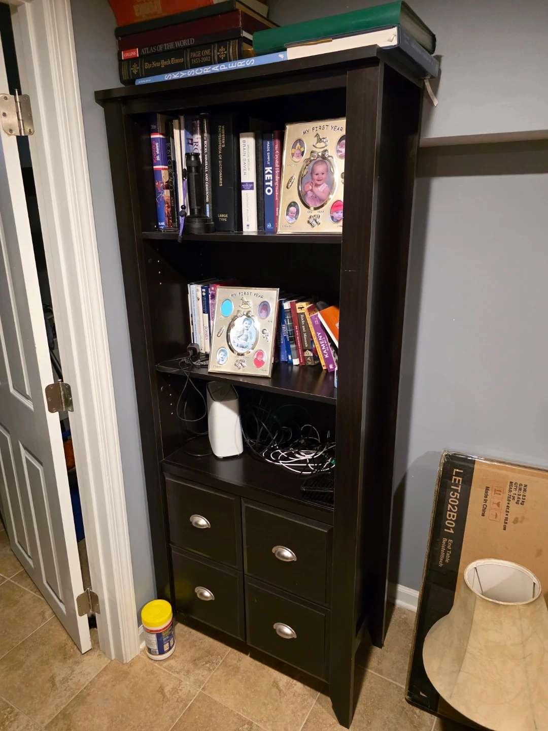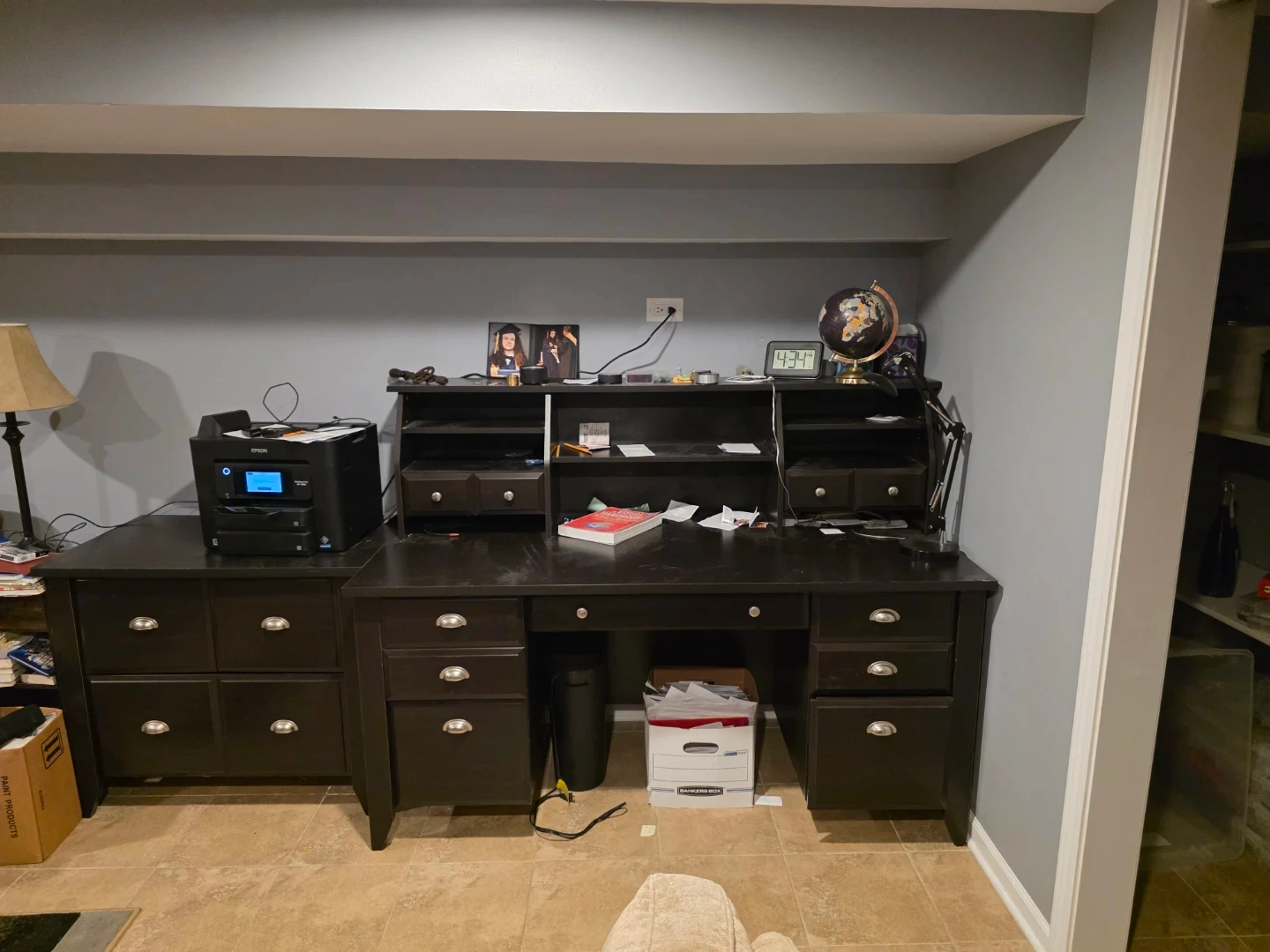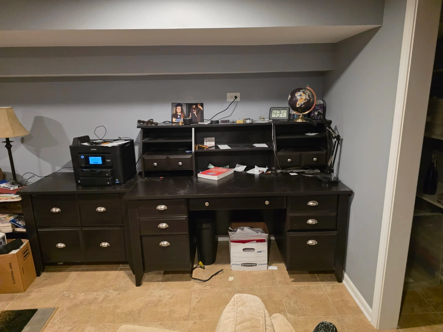 I'm selling a dark brown bookshelf and desk set. It's in good condition and has plenty of storage space. Perfect for a home office or study area!