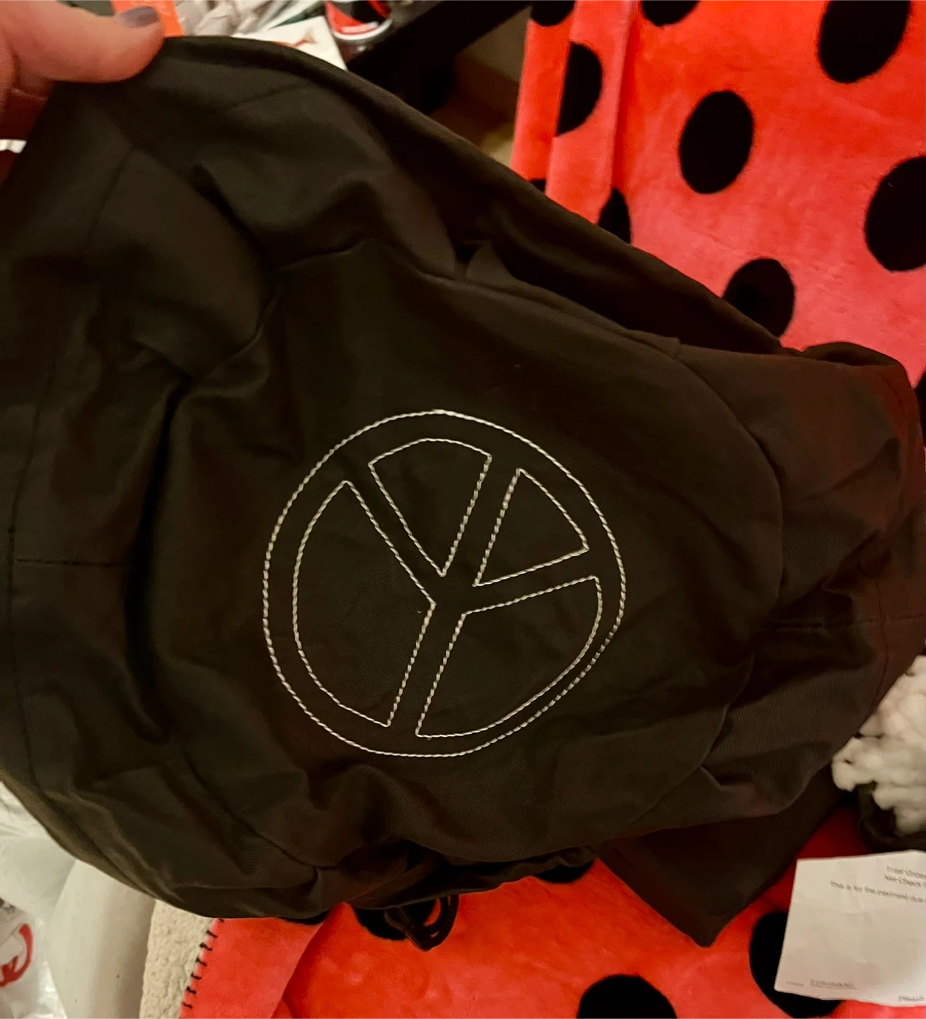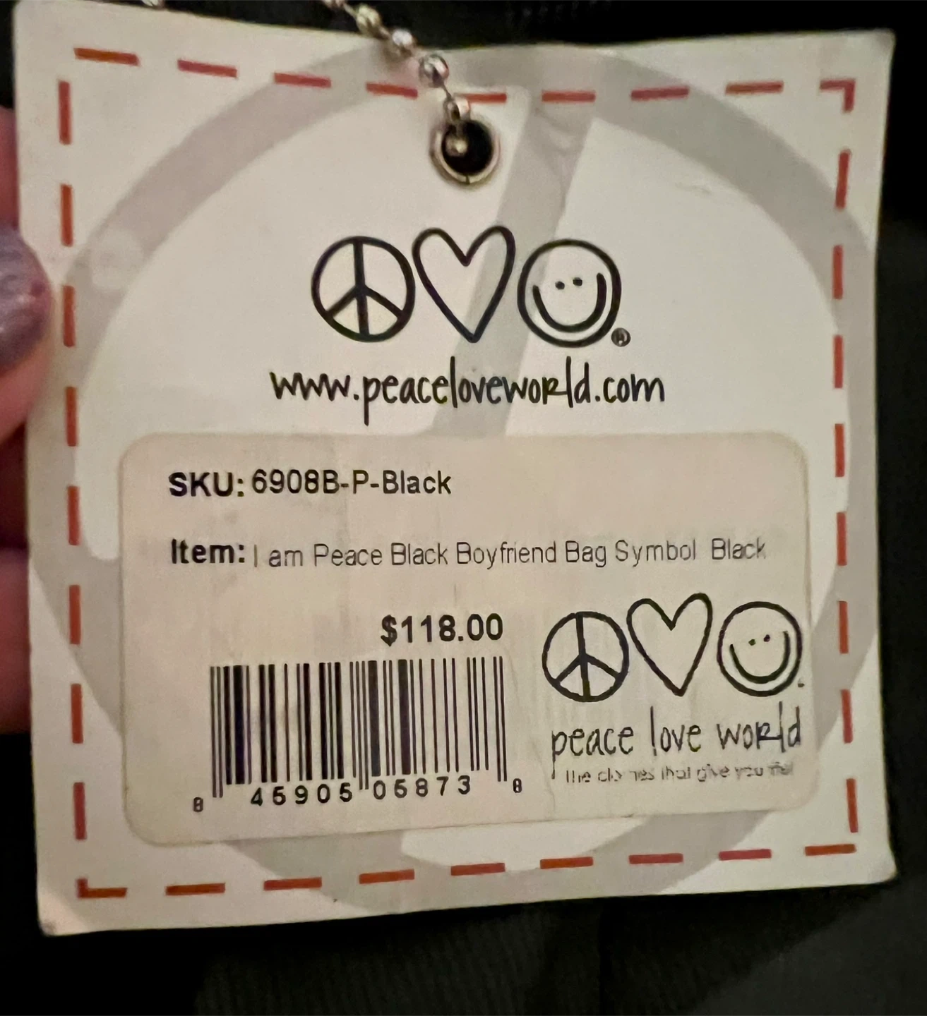 I am selling a Peace Love World black boyfriend bag. It has a peace sign and other symbols on it. Originally bought for $118