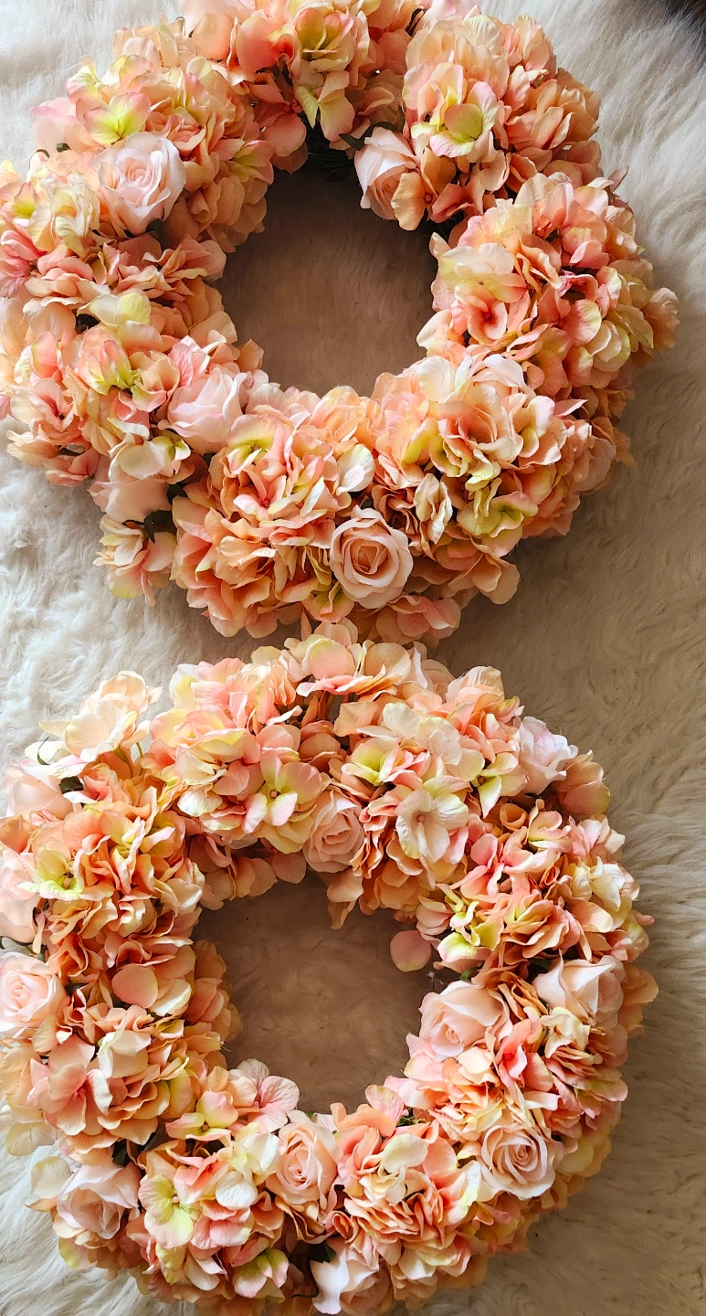 Two beautiful wreaths. Peach colored roses and hydrangeas. Perfect for spring and summer decor. Artificial flowers.