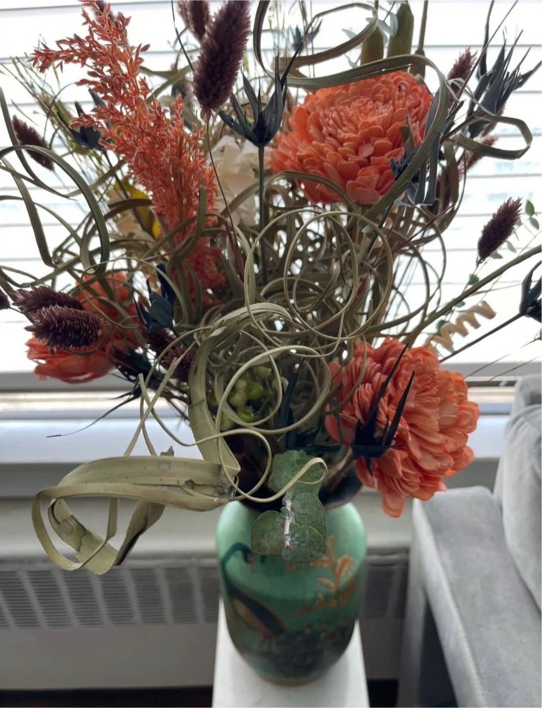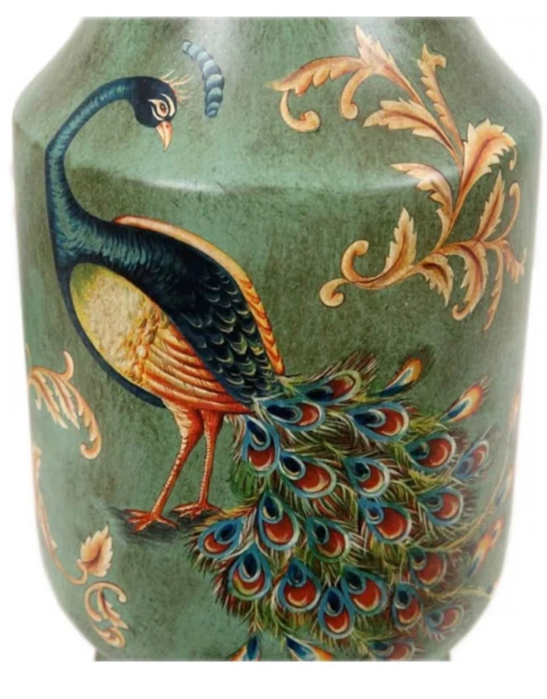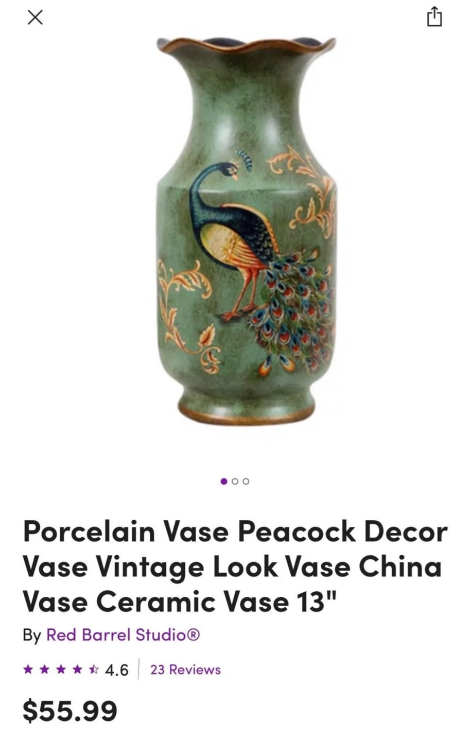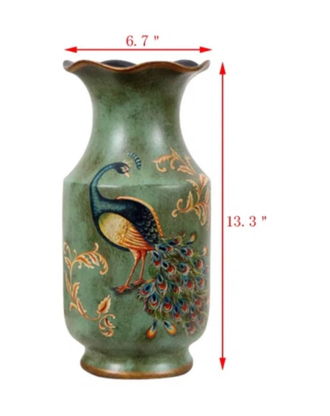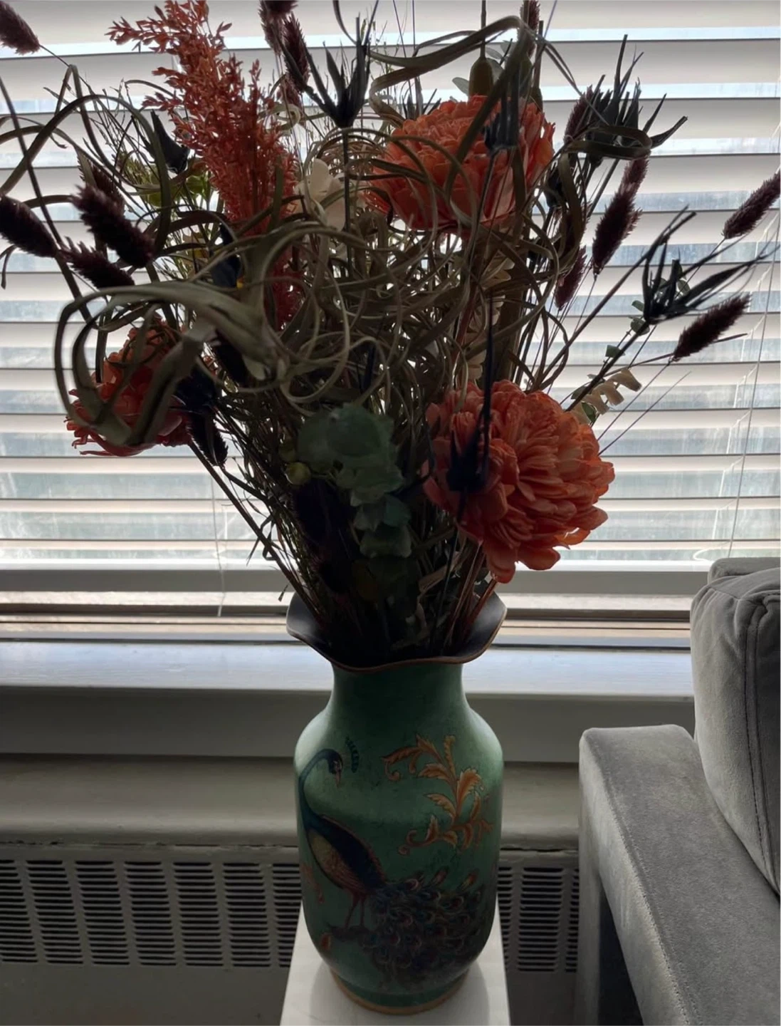 I'm selling a decorative vase with a beautiful peacock design! It's a porcelain vase with a vintage look. The vase is 13.3" tall and 6.7" wide. Flowers sold with vase.