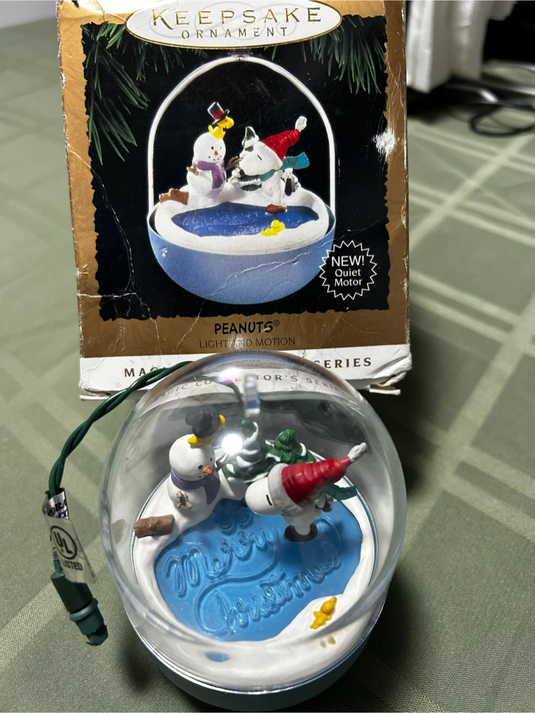 26Selling a Peanuts 1995 Light and Motion Keepsake Ornament! It features Snoopy and a snowman on a frozen pond. It's part of the Magic Cord Collector's Series and includes a quiet motor for light and motion. Comes with the original box This is a 1995 Hallmark Keepsake Ornament from the "Peanuts" series. The ornament features Snoopy and Woodstock on an ice rink. Product Name: 1995 Peanuts Magic Keepsake Ornament (Snoopy Skating) Snoopy skates on the ice, spelling out "Merry Christmas". Series: This was the fifth and final ornament in the Peanuts series. Power: It plugs into a standard miniature tree light string. Selling everywhere for 20$ or more. Was Asking $13 - REDUCED - NOW ONLY ASKING 10.00 Pick up in brooklyn.