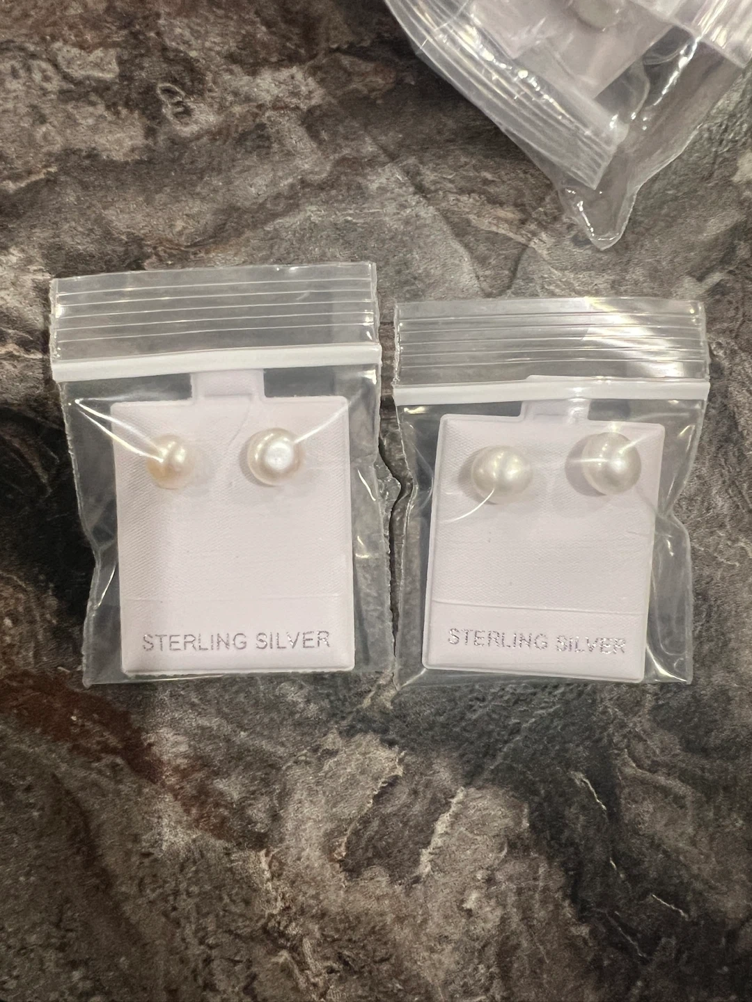 65These are a pair of pearl stud earrings with sterling silver posts. They come on a display card that also says sterling silver. They are brand new. I have 30 pieces available.