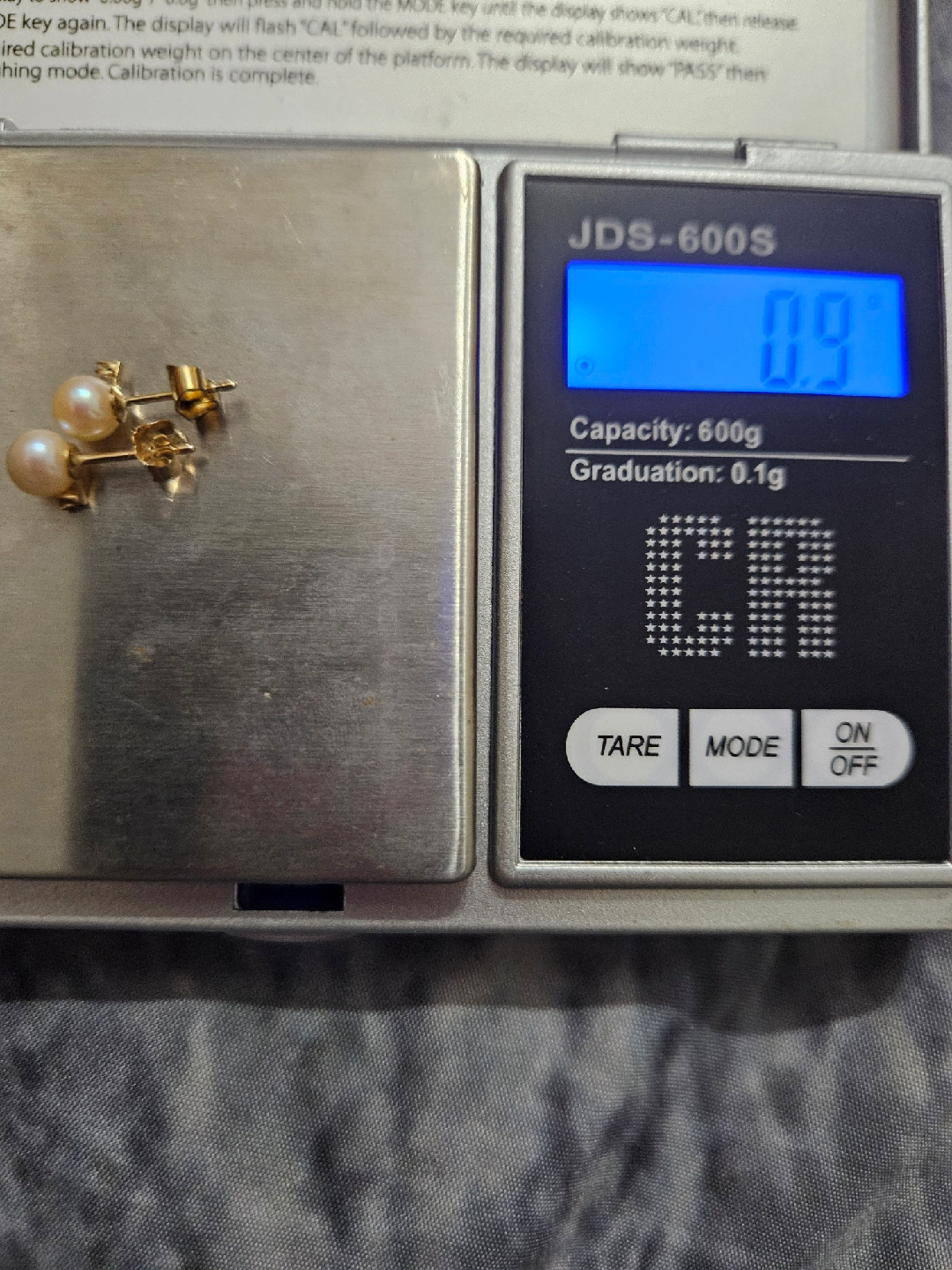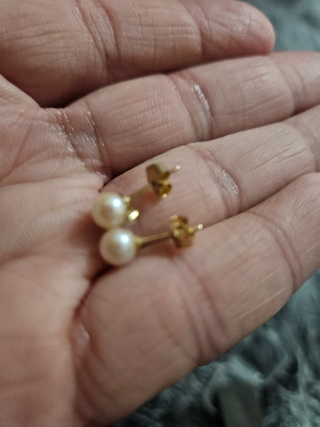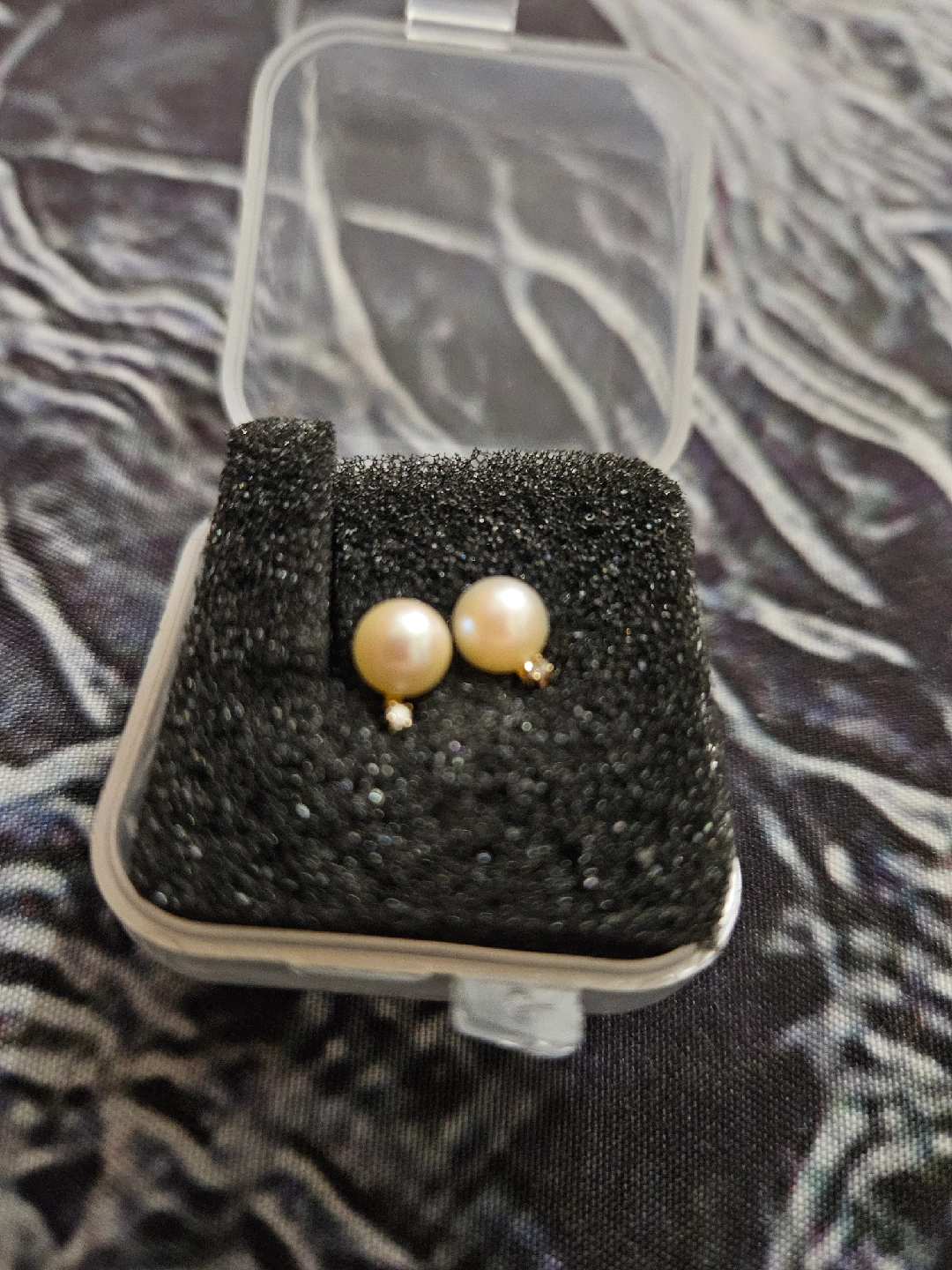 These are a pair of delicate pearl stud earrings with 14K gold posts. They come in a small protective case. They weigh 0.9g PICK UP ONLY