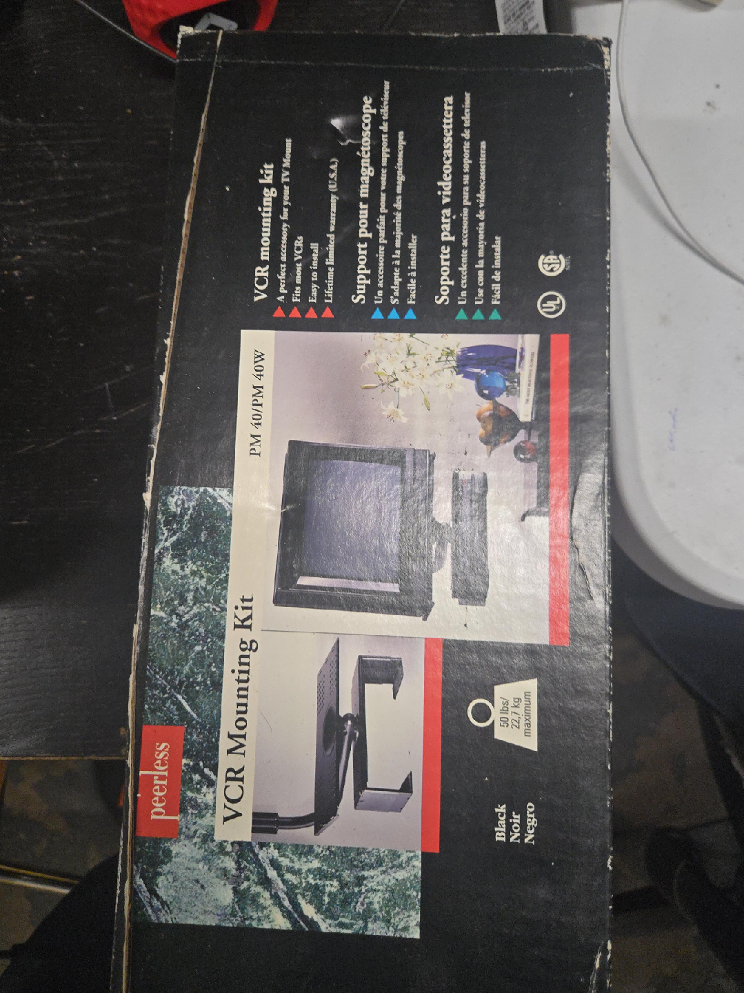 Selling a Peerless VCR Mounting Kit, model PM 40/PM 40W. It's black and can hold up to 50 lbs/22.7 kg. A perfect accessory for your TV mount and fits most VCRs. Easy to install and has a lifetime limited warranty (U.S.A.)