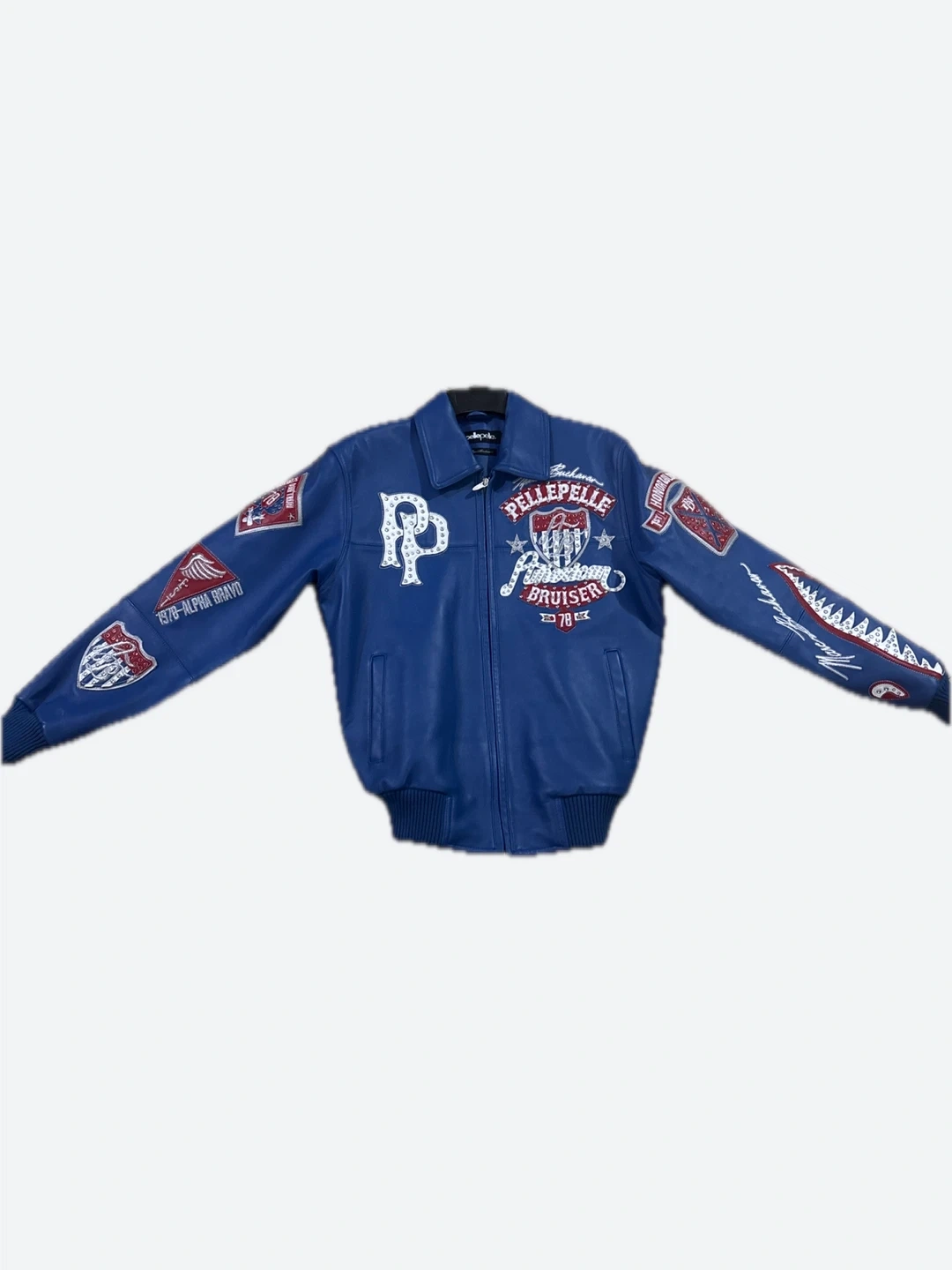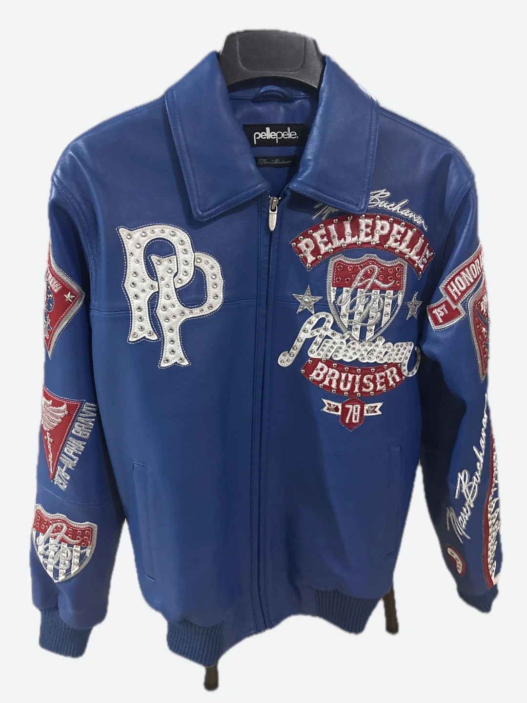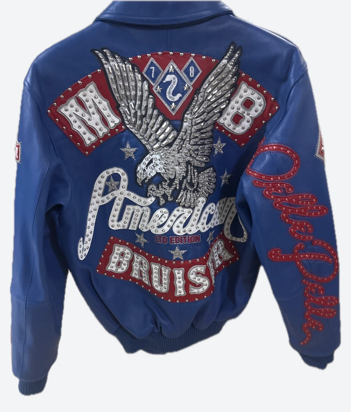 Selling a Pelle Pelle American Bruiser Limited Edition leather jacket. It features a blue color with intricate designs and embellishments, including an eagle and various patches. The jacket appears to be in good condition and is a unique statement piece!