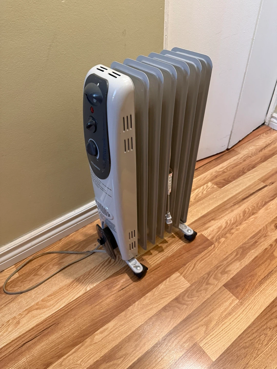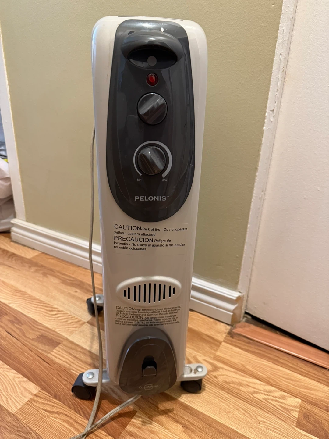 I'm selling a Pelonis electric oil-filled radiator heater. It features adjustable temperature settings from Min to Max for customized comfort. This heater is designed with safety in mind, including caution labels for safe operation. Perfect for keeping your space warm during the colder months!