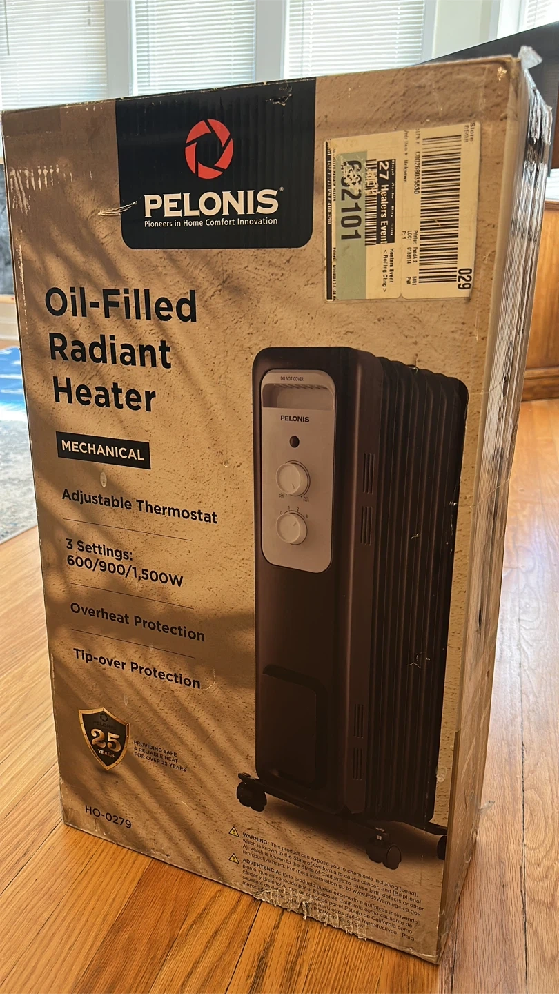 60Selling a brand new PELONIS Oil-Filled Radiant Heater! It's still in the original packaging and has never been used. Key features include: - Mechanical adjustable thermostat - Three settings: 600/900/1,500W - Overheat protection - Tip-over protection This heater is designed to provide safe and reliable heat for over 25 years!