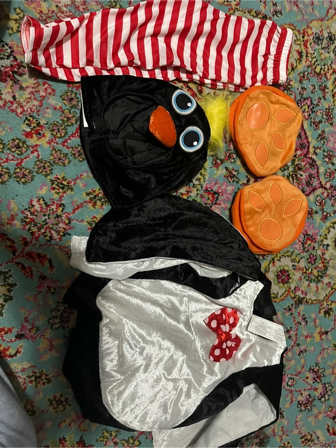 Selling a toddler-sized penguin costume! It includes the headpiece, body, foot covers, and striped pants. Perfect for dress-up or Halloween!