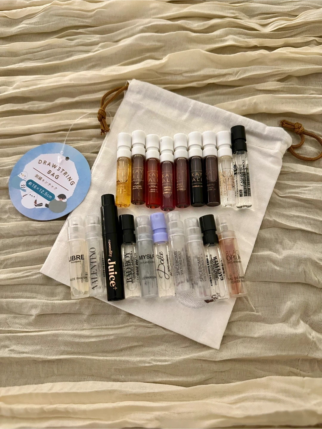 23Selling 19 perfume samples with a drawstring bag with a cute bird design!