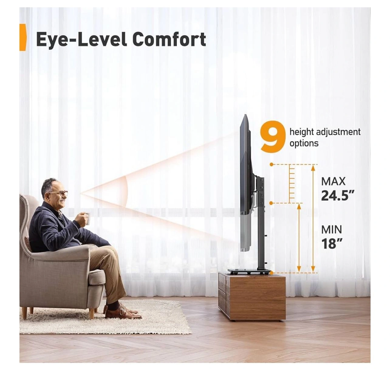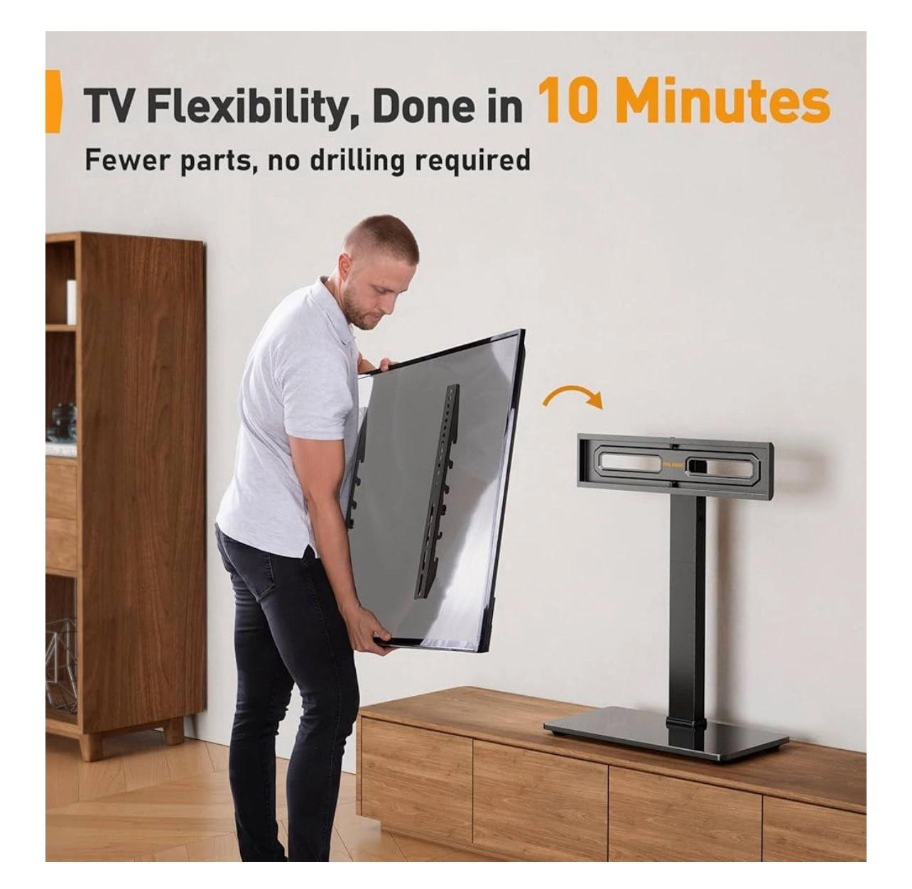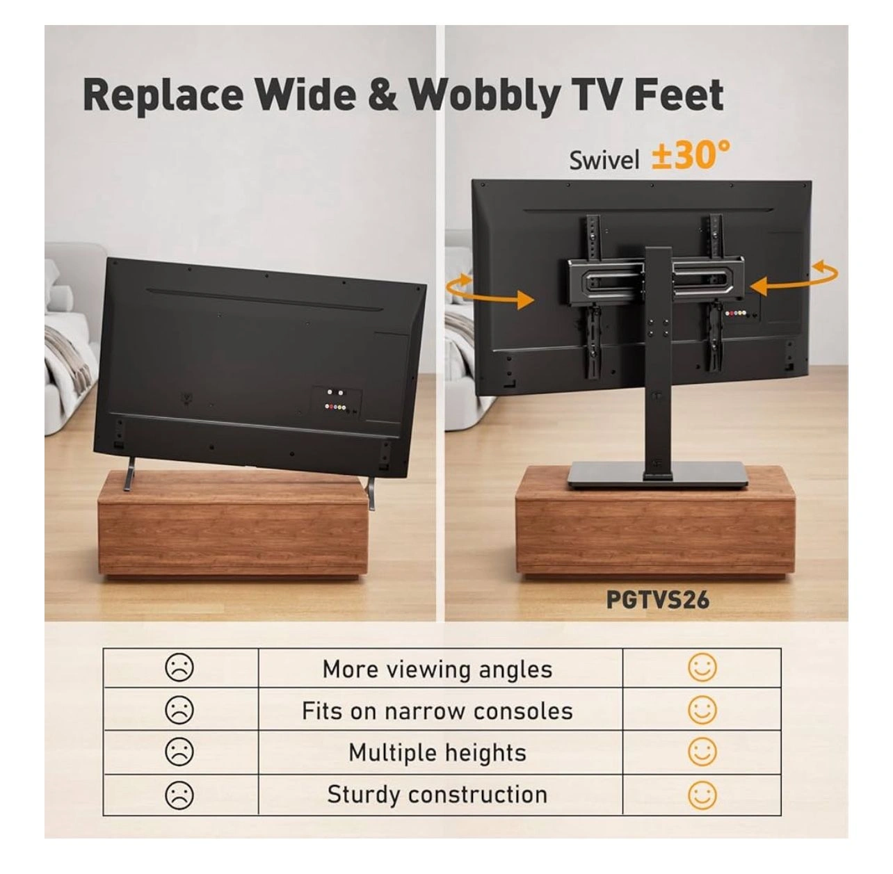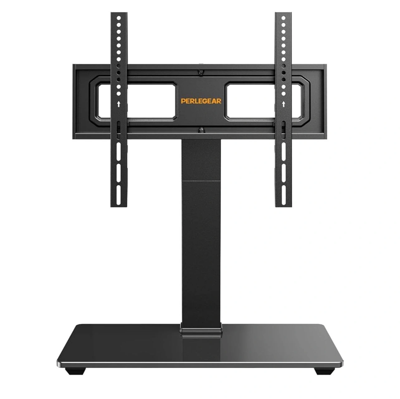 PERLESMITH Universal Swivel TV Stand fits most 37-75" LCD, LED, curved TVs like Samsung, Sony, LG, Sharp, Insignia, Vizio, Haier, Toshiba, Sharp, Element, and TCL. Fits VESA (mounting hole pattern) : 200x100mm (8"x4") 200x200mm(8"x8") 300x200mm (12"x8") 300x300mm (12"x12") 400x300mm (16"x12") 400x400mm (16"x16") 600x200mm(24"x8")and 600x400mm (24"x16"). This swivel tv stand conveniently swivels 30° right or left. It has 9 different height adjustment positions. This VESA TV stand securely holds up to 99lbs. Durable, high-quality steel construction ensures increased safety. Black tempered glass base adds a nice, sleek appearance to your home. Comes with all necessary mounting hardware that makes assembly as simple & easy as possible. Material: Metal Color: Black Style: Modern Type: Table top Brand: PERLESMITH