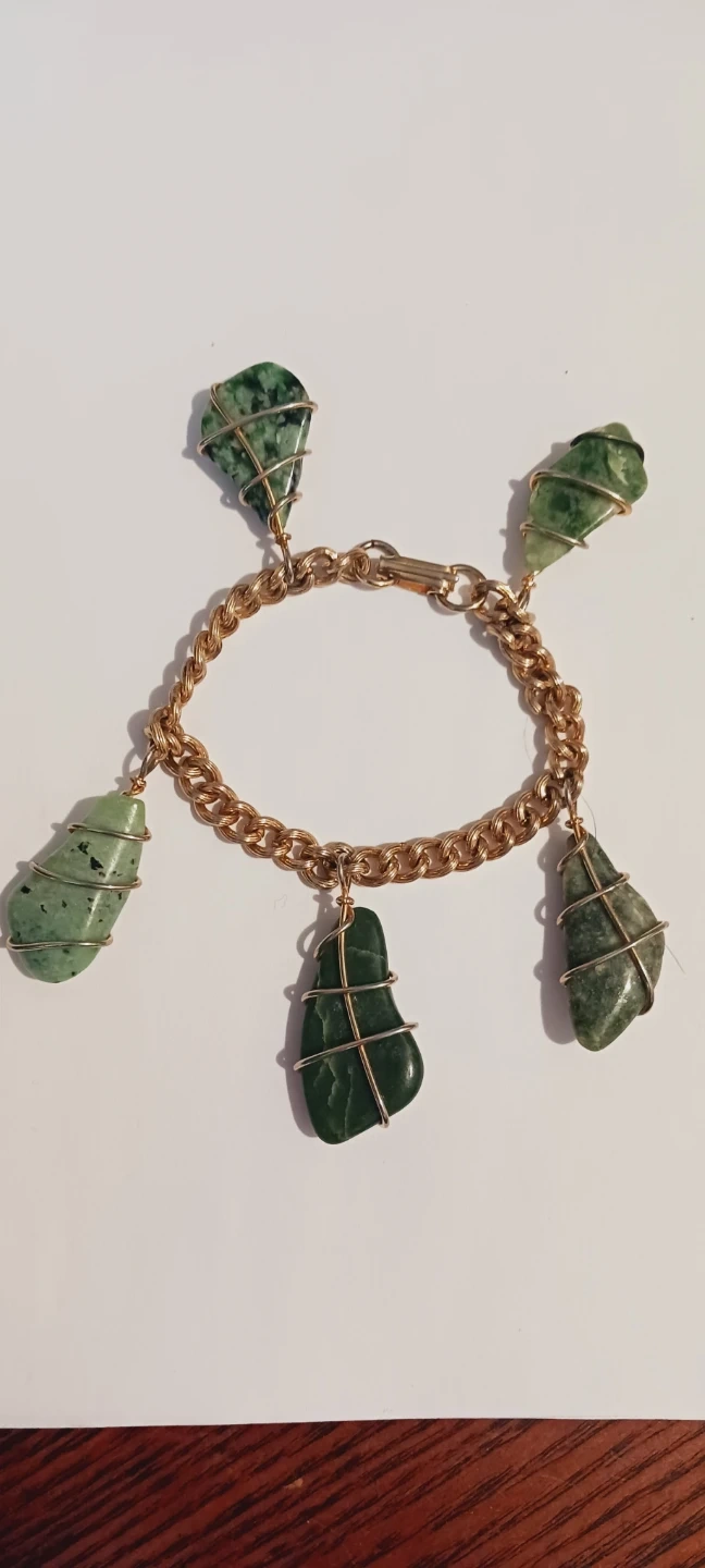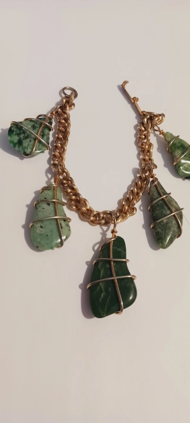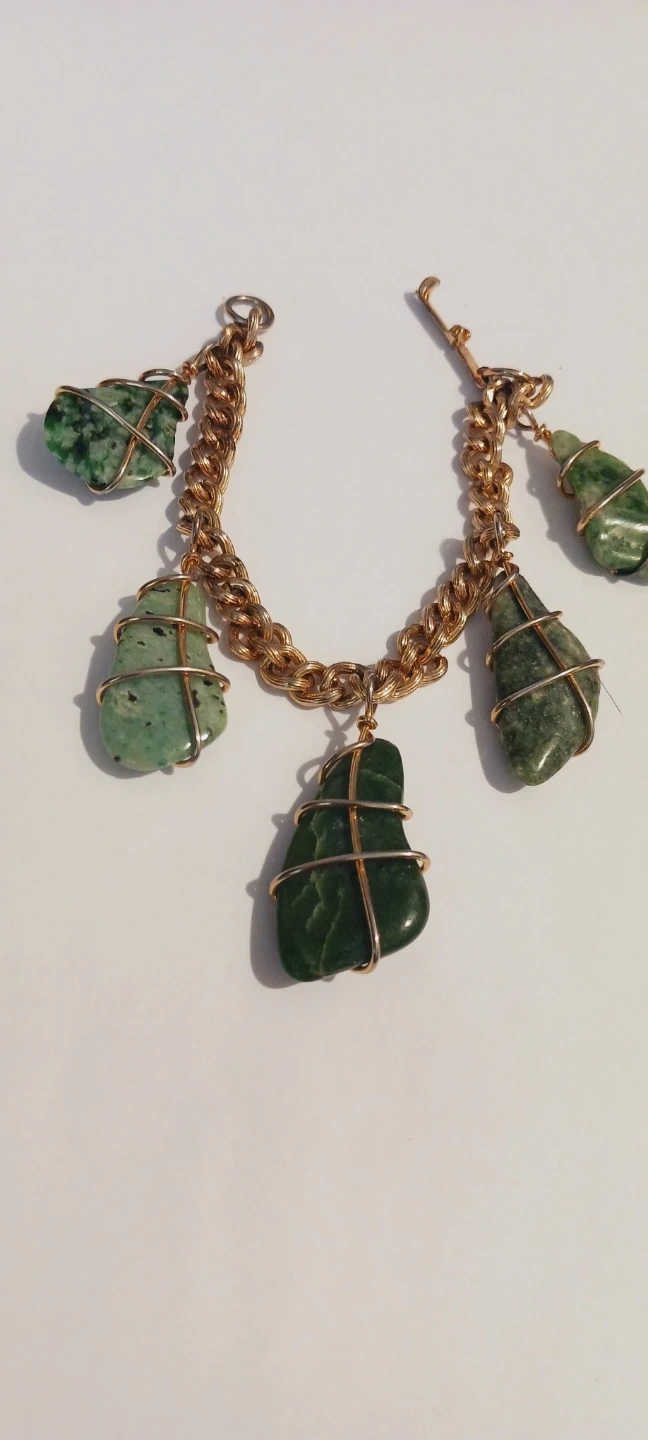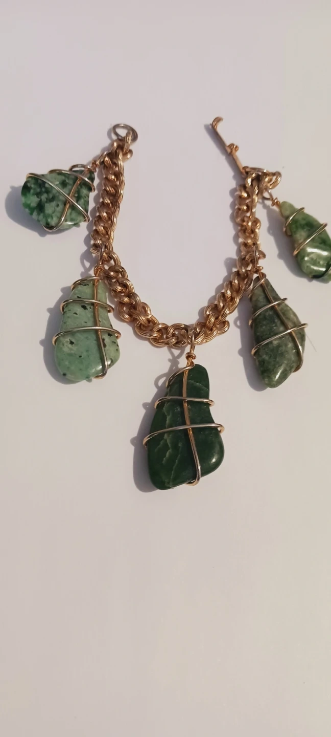 Genuine Green Gemstones Charms Gold Tone Chain Bracelet. 6".