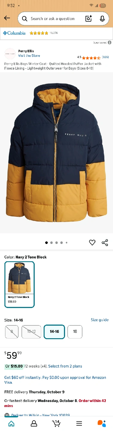 Selling a Perry Ellis boys winter coat in size 10-12. It's a quilted hooded puffer jacket with fleece lining. The color is Navy 2 Tone Block. It's a lightweight outerwear, perfect for boys!