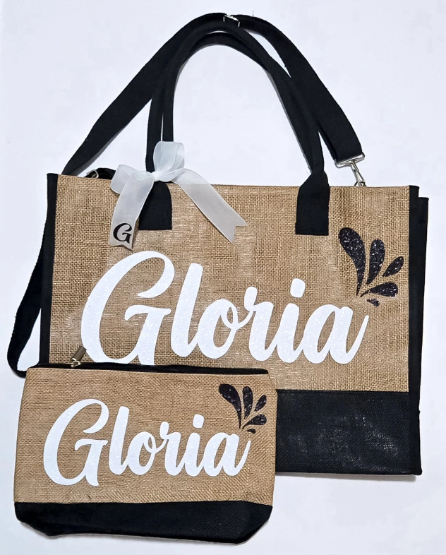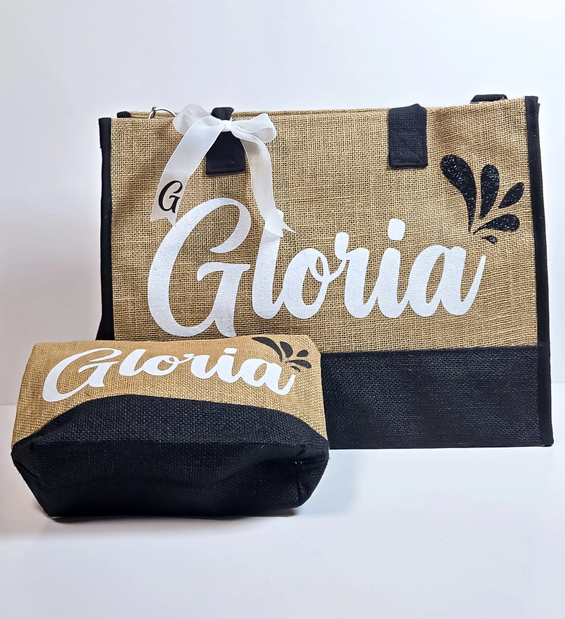 10I'm selling a cute jute tote bag with a matching pouch! The bag and pouch are personalized with your name. It's perfect for shopping or carrying your essentials in style