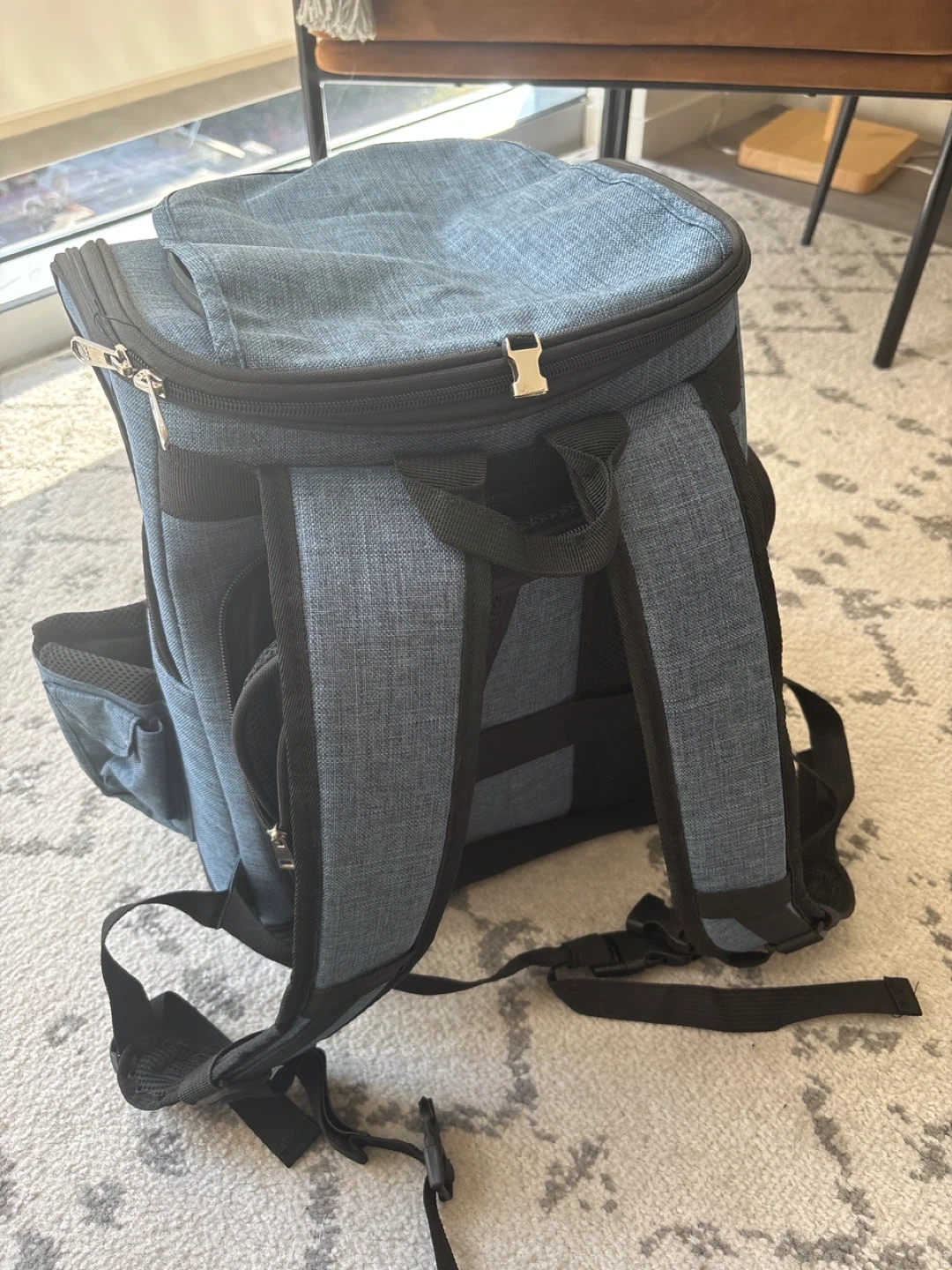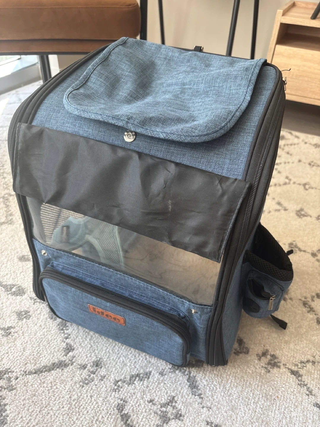I'm selling an pet carrier backpack in blue! It's in great condition and ready for your furry friend's adventures. This backpack is perfect for travel and outings, making it easy to bring your pet along.