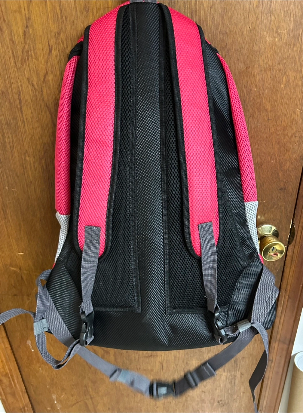 Pink and black pet carrier backpack. Multiple pockets. Mesh design for ventilation. Adjustable straps. Great for carrying pets from 20 lbs up to 35lbs.