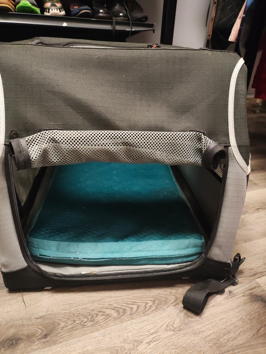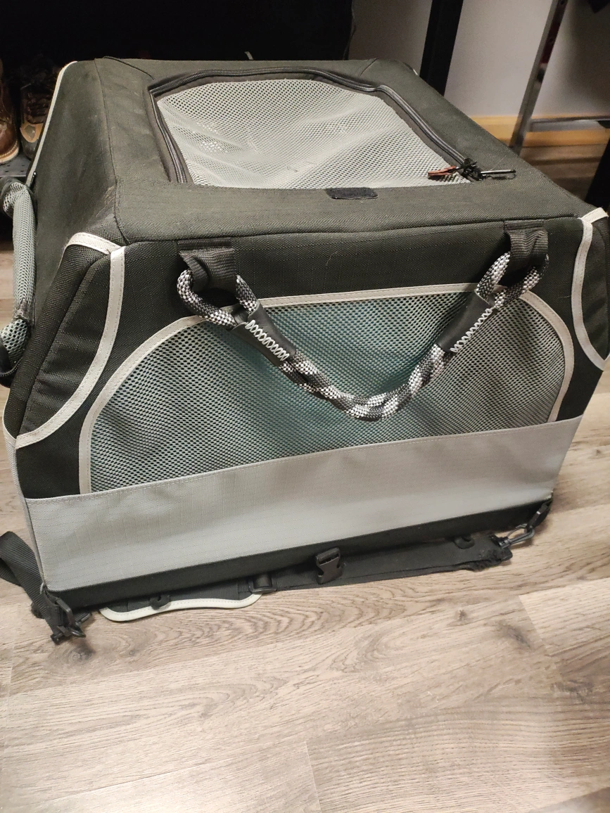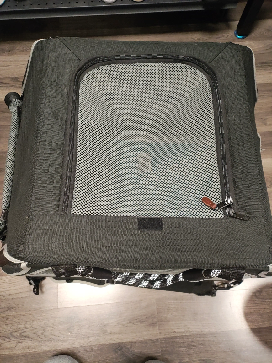Selling a pet carrier in good condition! It's black and gray with a mesh window on top. Perfect for taking your furry friend on trips or to the vet