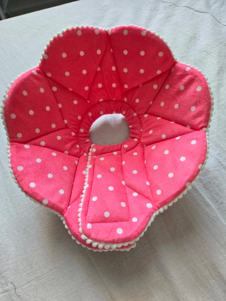 70Selling a pet recovery soft cone in size M! This cone is pink with white polka dots and a white pompom trim.