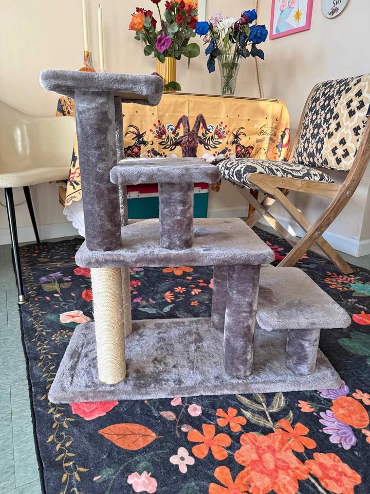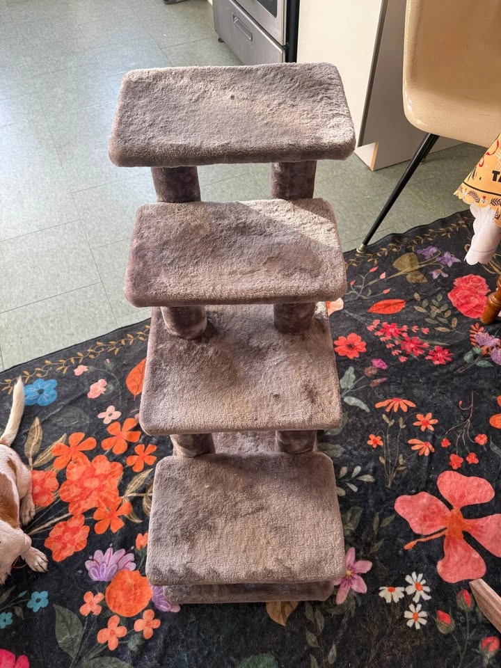 Barely used nonslip pet stairs. Perfect for small spaces, these stairs have a compact footprint while still providing ample height. Originally $65, My cat unfortunately never took to it, but it's still in great condition and can be easily reassembled to fit your specific needs. A great value for pet owners!
