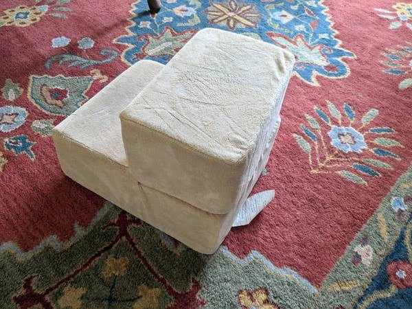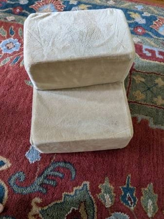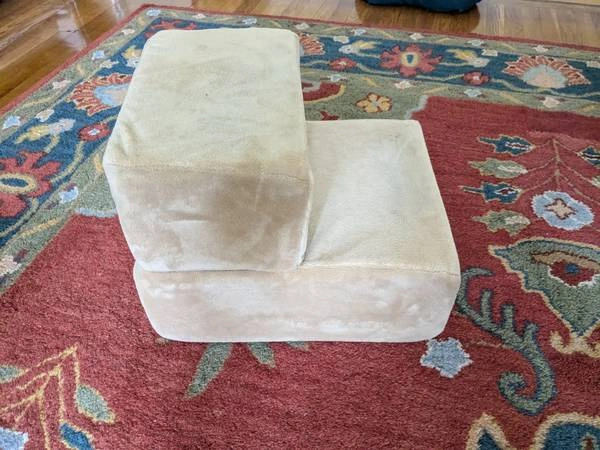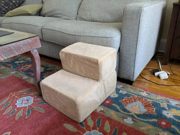 For sale: Zinus brand 2 step foam dog stairs. Perfect for a small cat or dog who can't jump up onto the couch or bed. Cover is removable and clean. Each step is 6.5 inches high and 8.5 inches deep. The whole thing measures 14 x 17 x 13 inches. Link to product: https://www.chewy.com/zinus-comfort-cat-dog-stairs/dp/184992