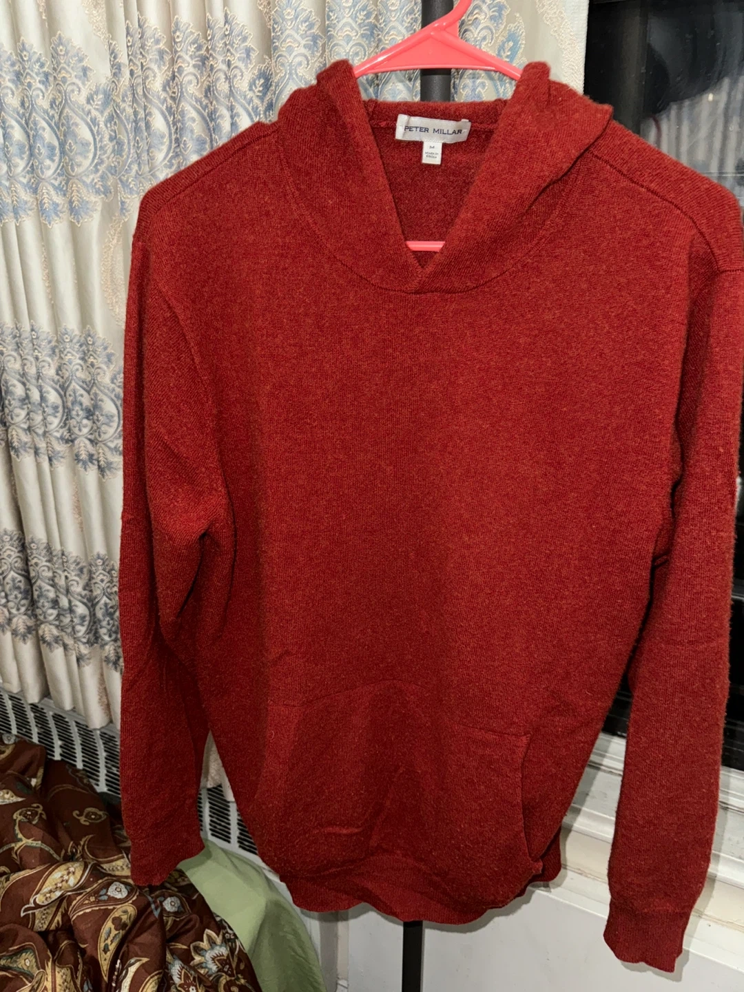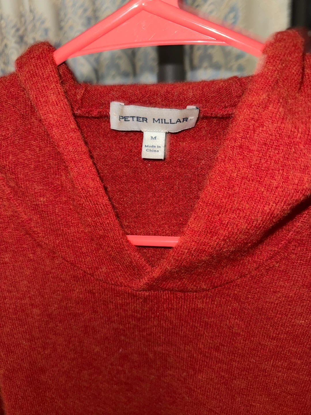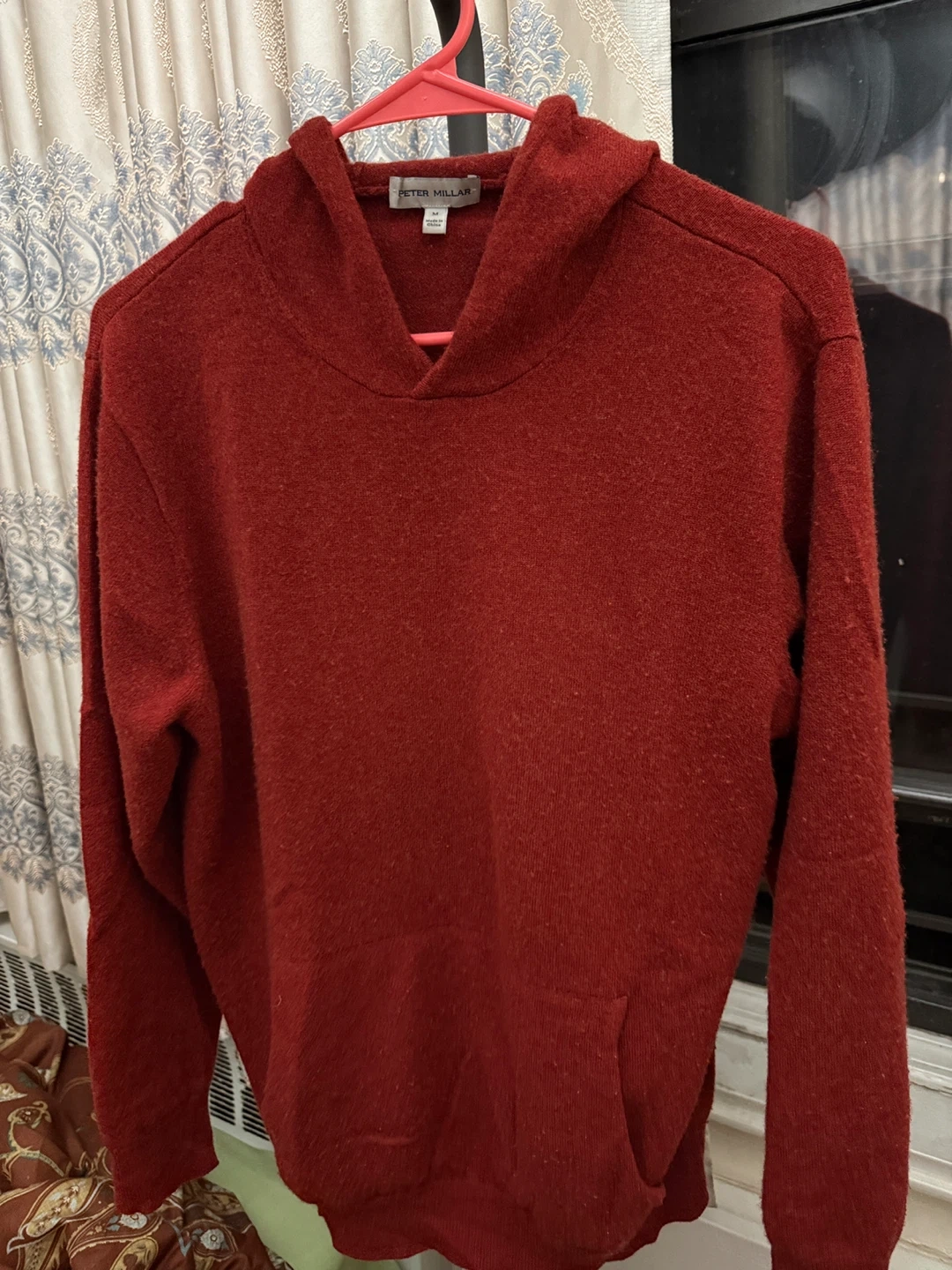Selling a Peter Millar hoodie in a reddish-brown color. It's a size medium and in great condition! Perfect for layering or wearing on its own