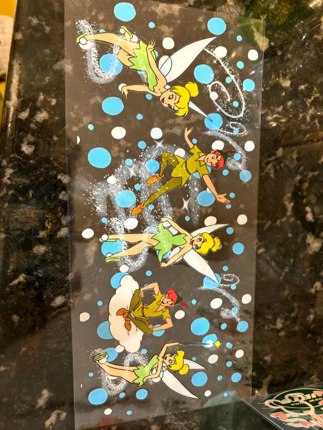 10Here's a cute Peter Pan and Tinkerbell sticker! It features a fun design with Peter Pan and Tinkerbell characters surrounded by blue and white polka dots and glittery accents for cups