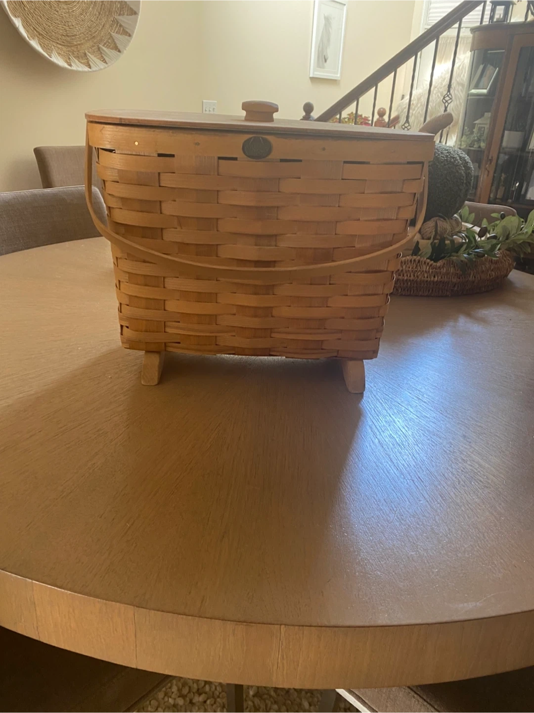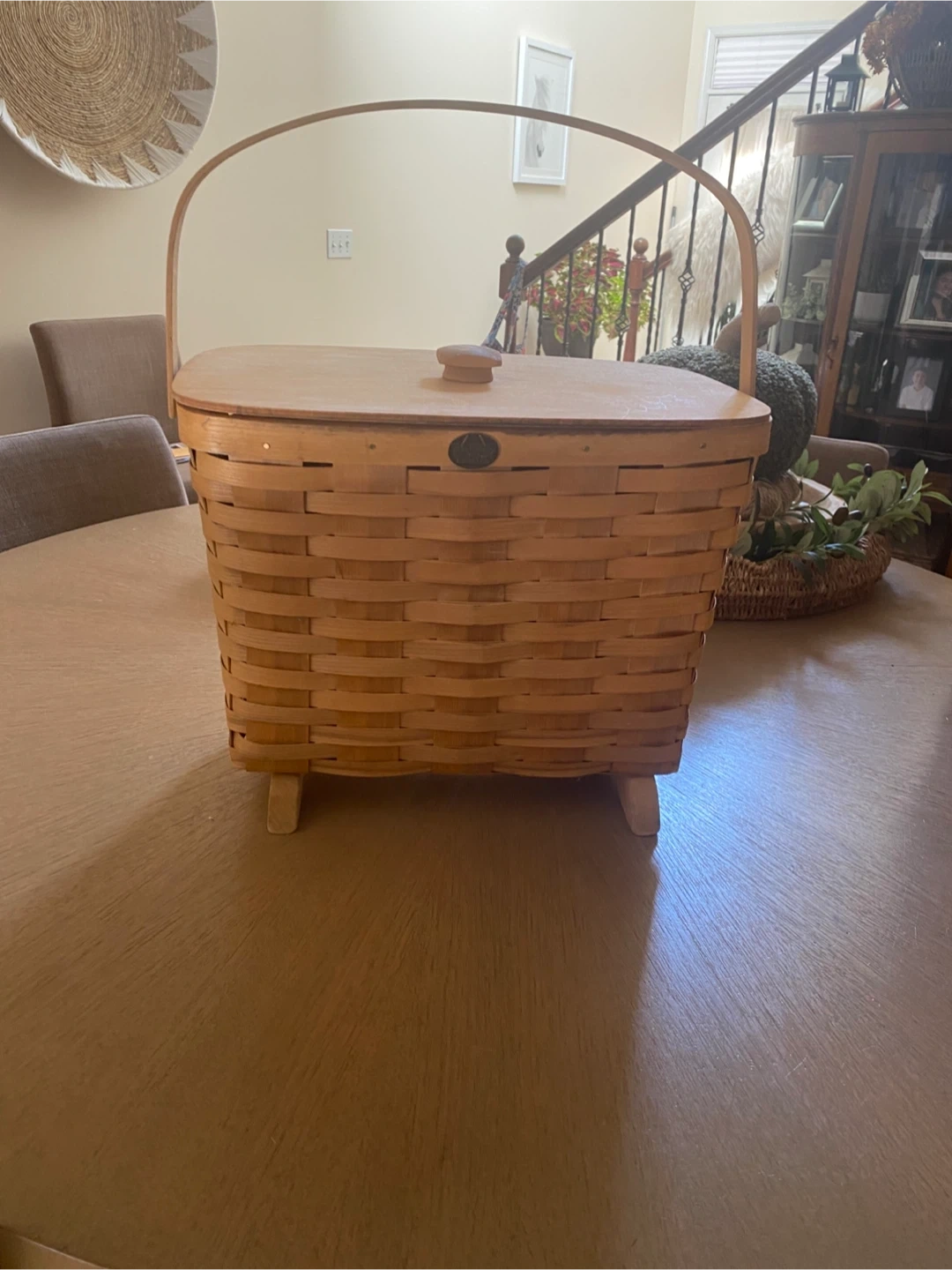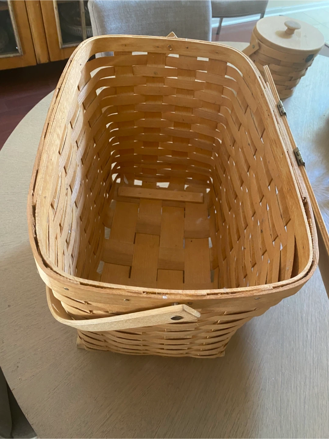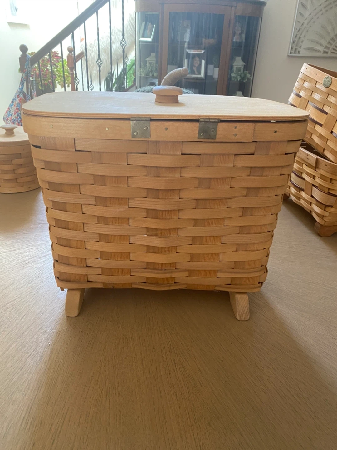 10Here is a lovely PeterBoro basket with base and with attached lid! It's in great condition and ready for a new home. Perfect for storage or magazines or for knitting supplies or throw. Cash only