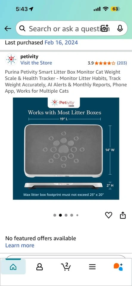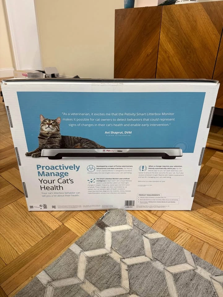 Petivity Smart Litter Box Scale, powered by AI technology, tracks your cat’s health. This device records your cat’s weight, urination, and defecation events every time they use the litter box. Data is delivered to the Petivity app in easy-to-read charts and monthly email reports, along with alerts for changes that may indicate a potential health concern. Condition: Used – purchased in 2024 for $150. Slightly discolored. Power: Requires 6 AA batteries (not included). Does not come with the power cord. Packaging: Comes with original box. Features: Tracks up to 5 cats. Alerts for changes in weight or litter box habits. Helps you provide data to your vet if needed. Recommended one monitor per litter box for multi-box households. Pickup is on 72nd and 1st in Manhattan. Preference given to whoever schedules pickup first.