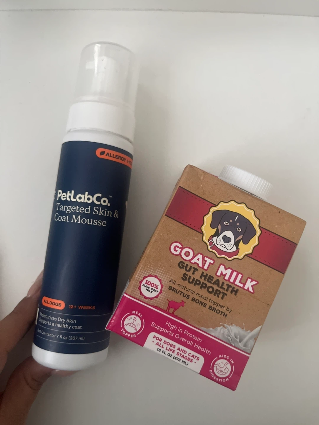I'm selling a PetLab Co. Targeted Skin & Coat Mousse for all dogs, suitable for 12+ weeks. It helps moisturize dry skin and supports a healthy coat. Net contents: 7 fl oz (207ml). Also included is Goat Milk Gut Health Support, an all-natural meal topper by Brutus Bone Broth. It's high in protein and supports overall health for dogs and cats of all life stages. 16 fl oz (473 ml)