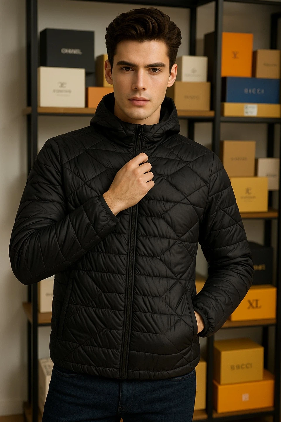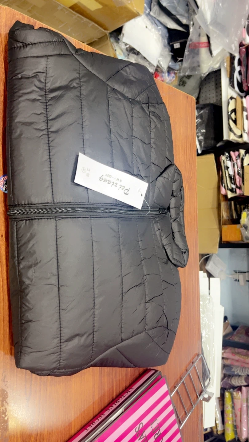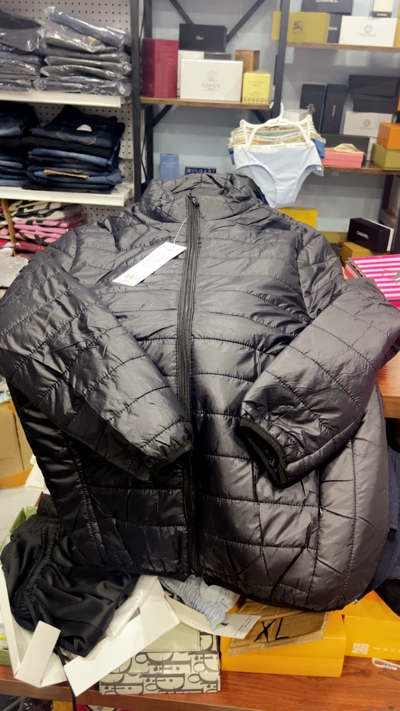 This is a black puffer jacket from Petoung. and ready for a new men It is lightweight and portable in size S, M, L