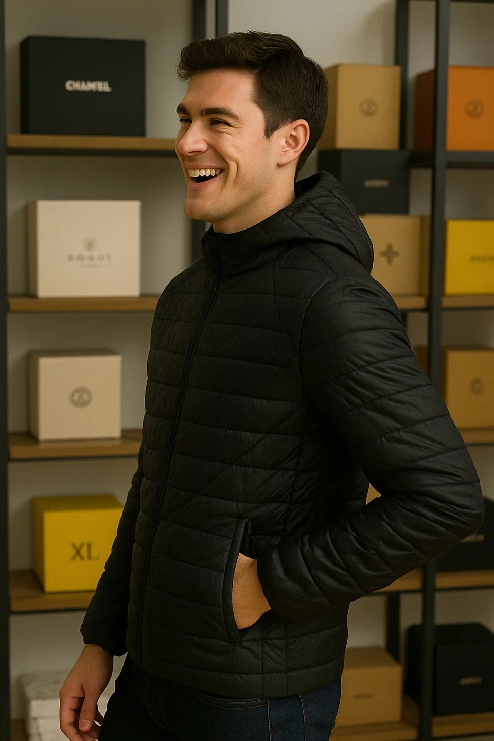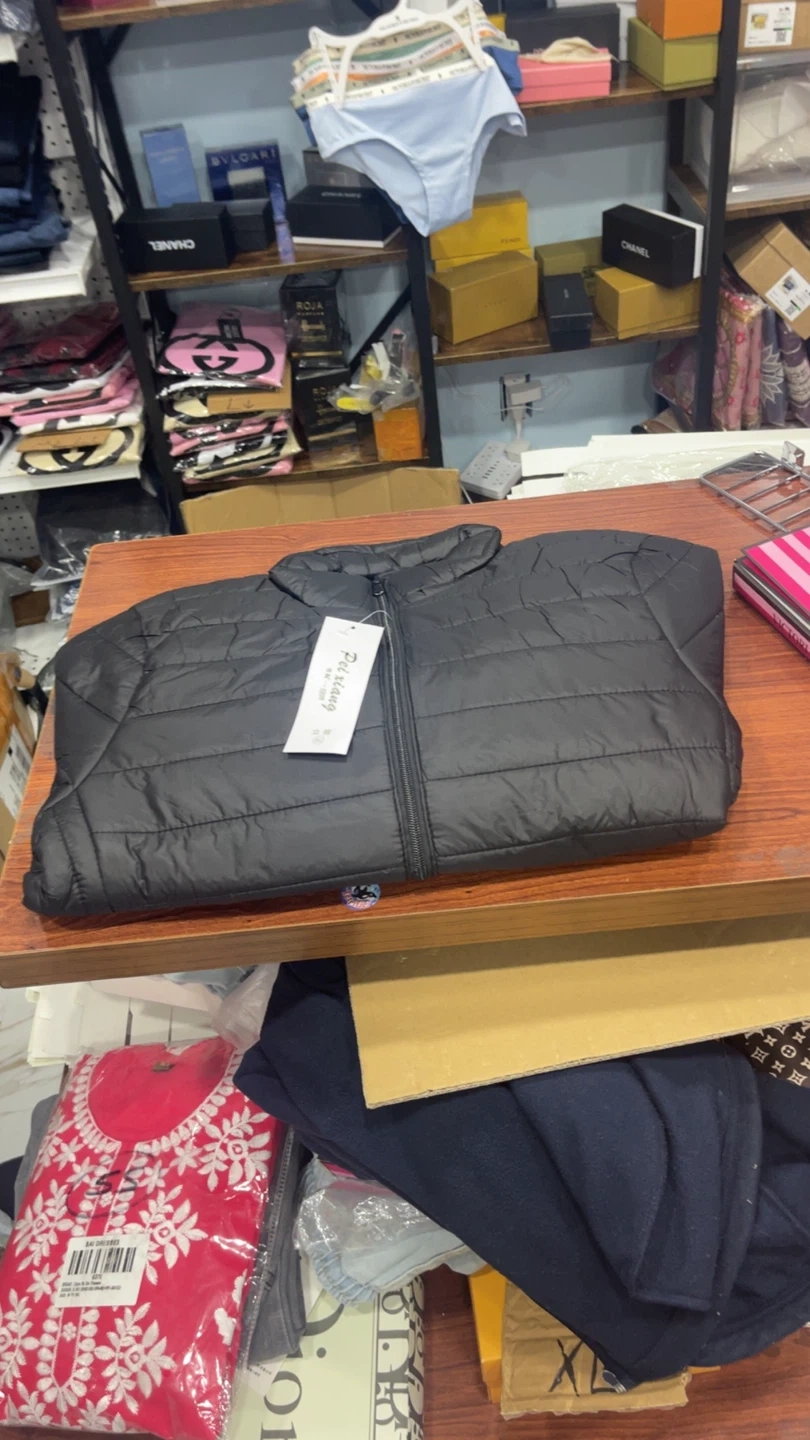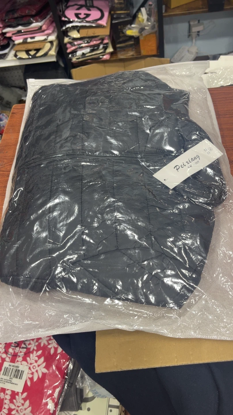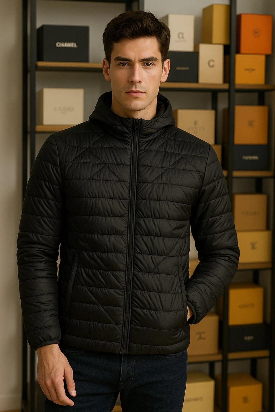 This is a black puffer jacket from Petoung. and ready for a new men It is lightweight and portable in size S, M, L