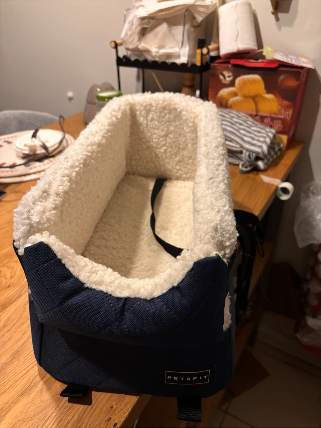 15I'm selling a PETSFIT dog car seat bed in navy blue. It's in great condition and ready for your furry friend's next road trip! The seat is designed to keep your pet safe and comfortable while traveling. It features a soft, plush interior and sturdy straps to secure it in your car. Used but in good condition L 15 inches x W 9 inches x H 7.5 inches Reference; I have a Morkie