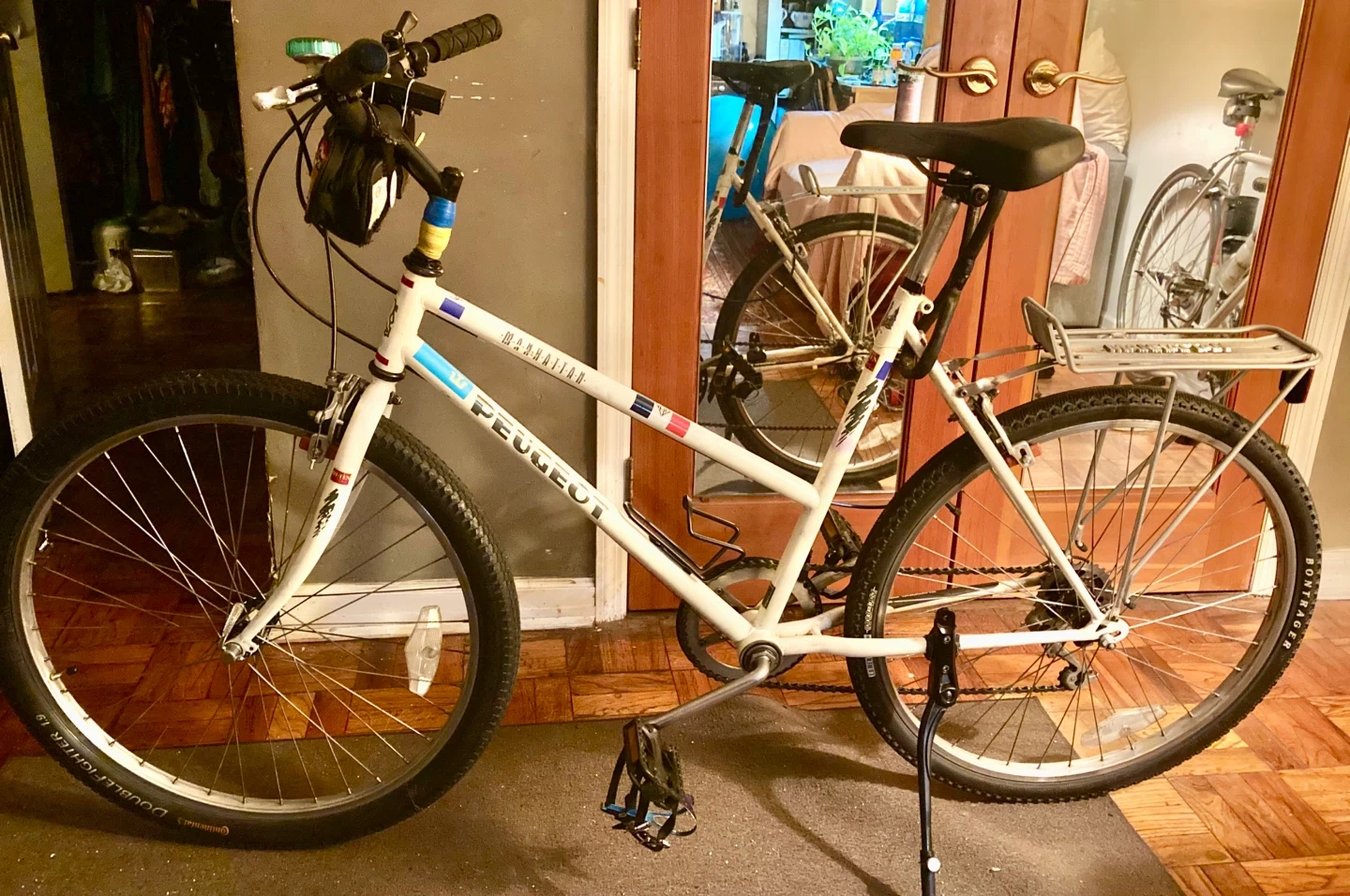 39Selling a Peugeot “Manhattan” non electric bike. It has a Shimano 6 gears system. Very clean, well lubricated, no rust, smooth ride. Comfort saddle is anti-theft chained, non slippery pedals. Handlebar is wide, with nice grips, strong brake levers and precise gear shifter, free rear rack, kickstand, water bottle cage and bell. Very comfortable upright riding position. Great for groceries shopping or safe riding with traction tires.
