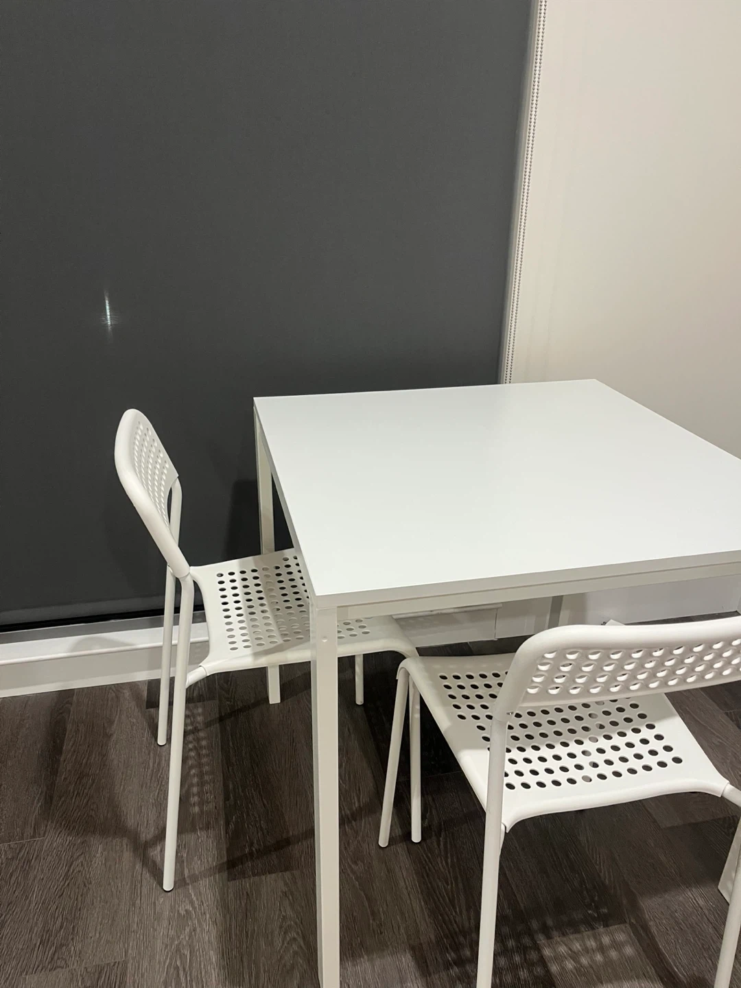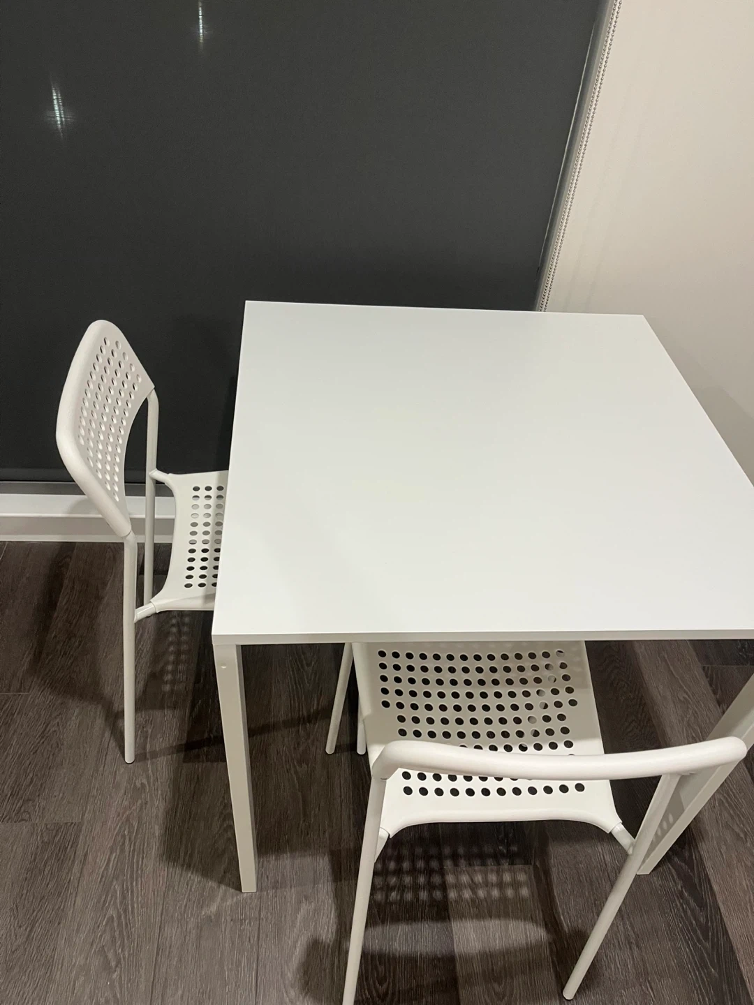 This is a white IKEA dining set featuring a square table and two matching chairs.