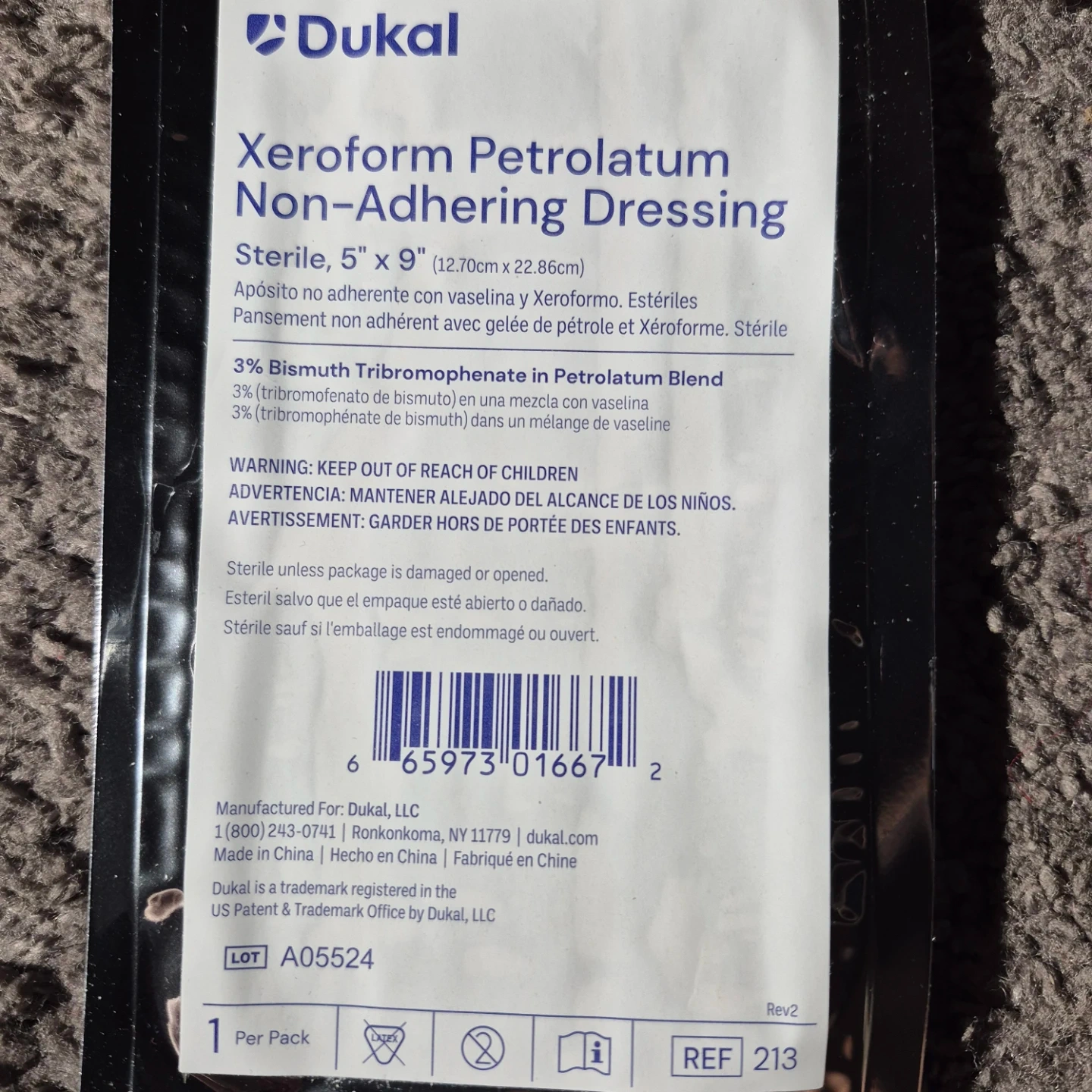 This is a Dukal Xeroform Petrolatum Non-Adhering Dressing. It's sterile and measures 5" x 9". It's made with a 3% Bismuth Tribromophenate in Petrolatum Blend.