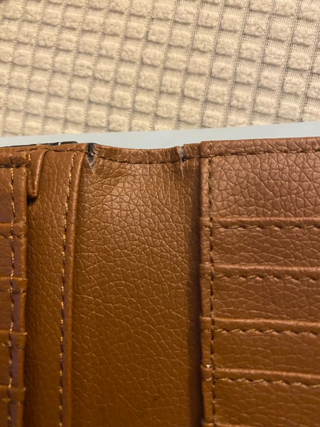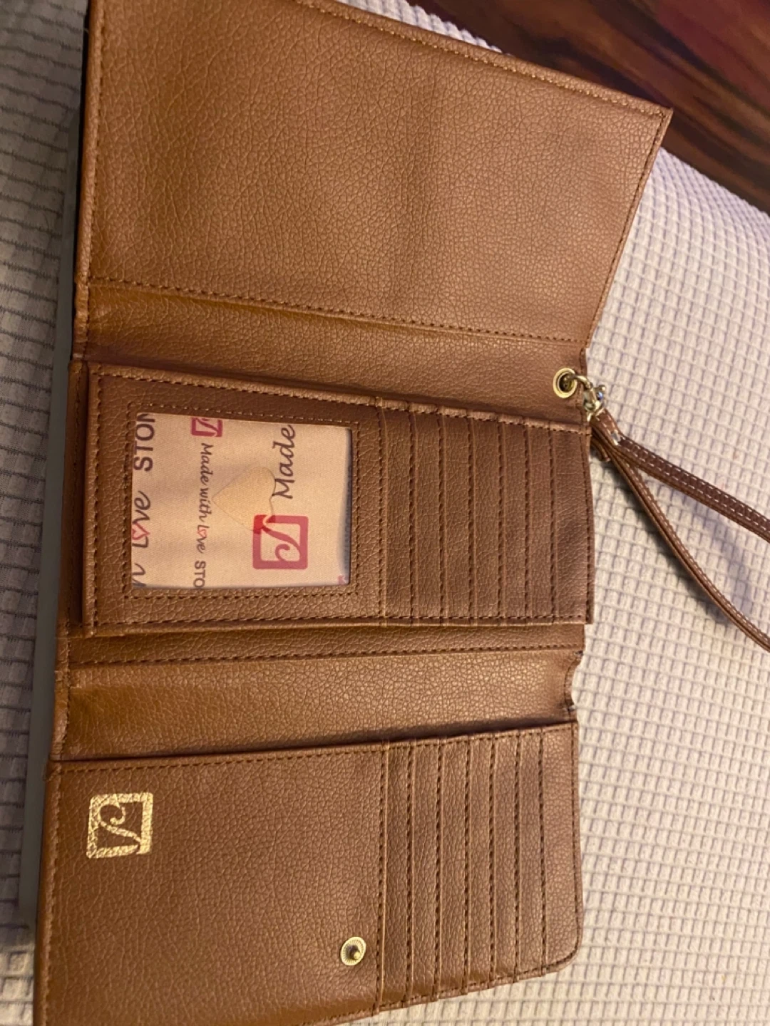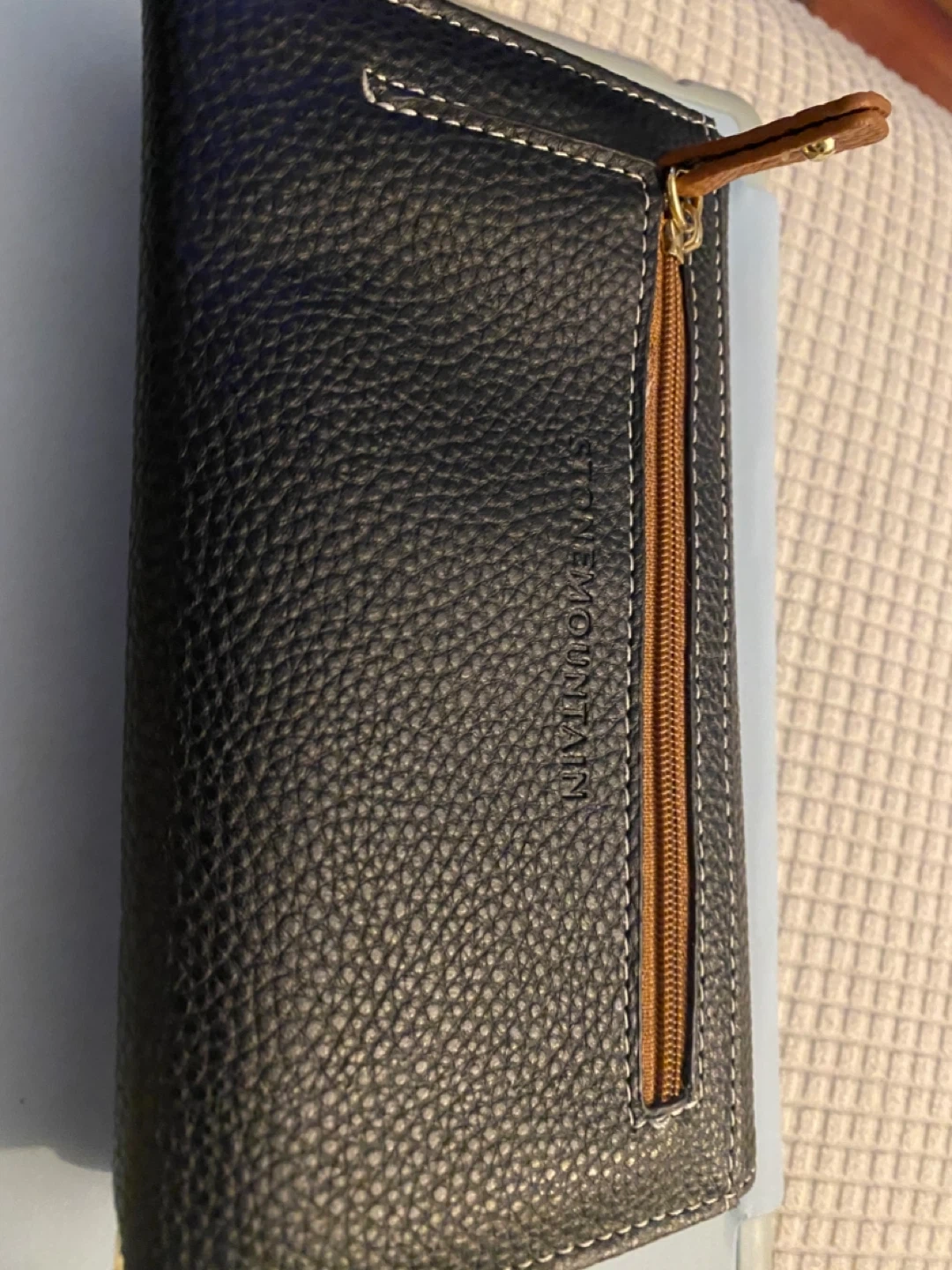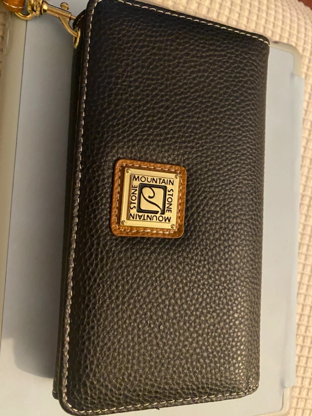 Stone Mountain black pebbled leather wallet with zip around closure. Interior features multiple card slots and ID window. Includes a wrist strap for easy carrying. Have some sign the wear in the side