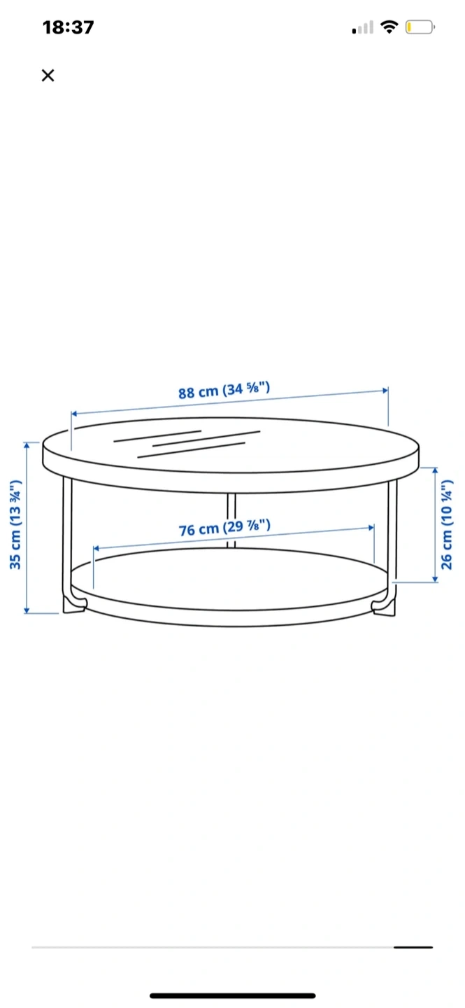It's 34 5/8 inches in diameter. This stylish coffee table originally retailed for $349.99