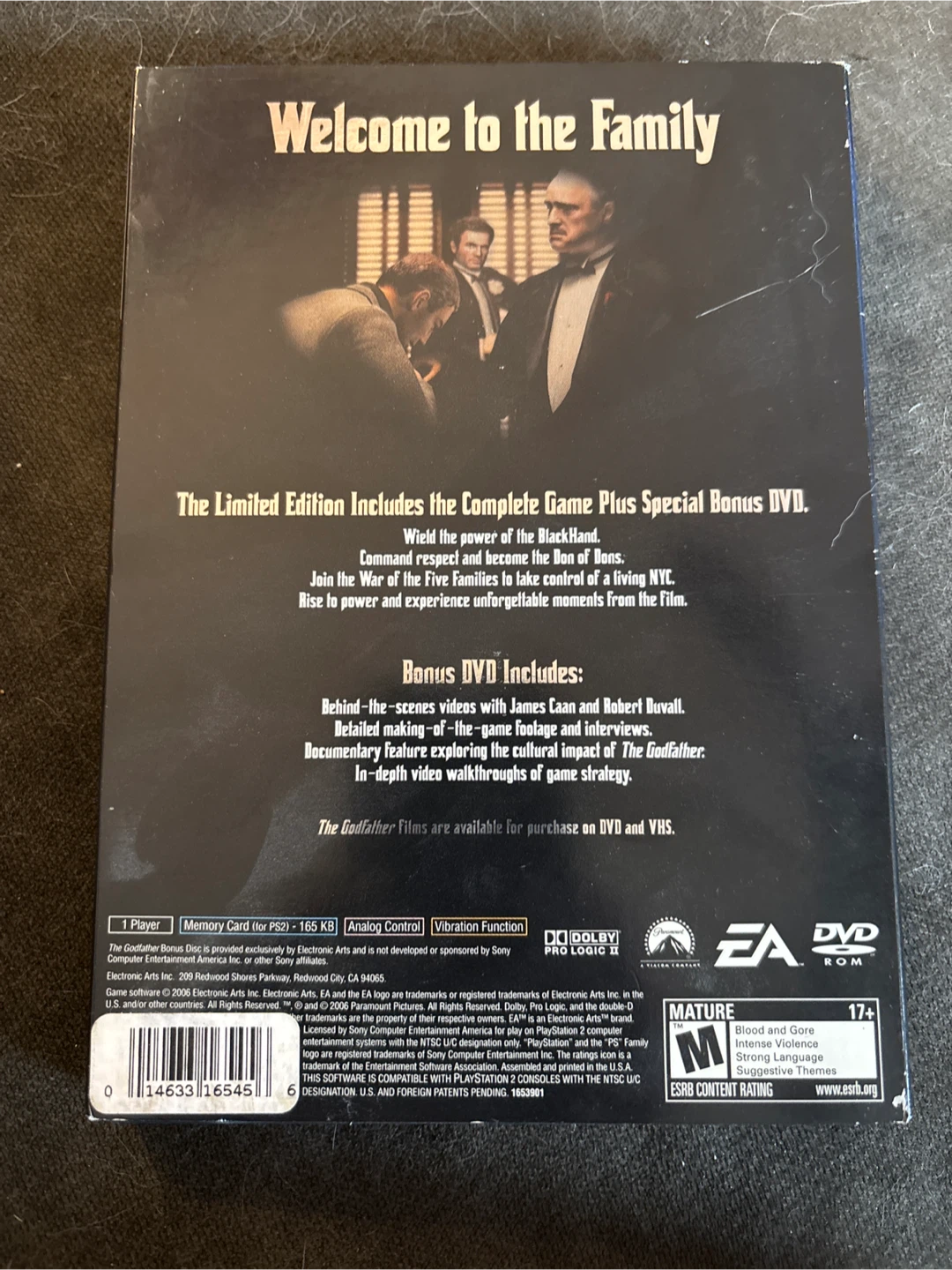 Selling a copy of The Godfather for PlayStation 2, Limited Edition. The game includes the complete Game Plus Special Bonus DVD, offering behind-the-scenes videos with James Caan and Robert Duvall. It also features detailed making-of the game footage and interviews, along with a documentary exploring the cultural impact of The Godfather. Dive into in-depth video walkthroughs of game strategy and experience unforgettable moments from the film