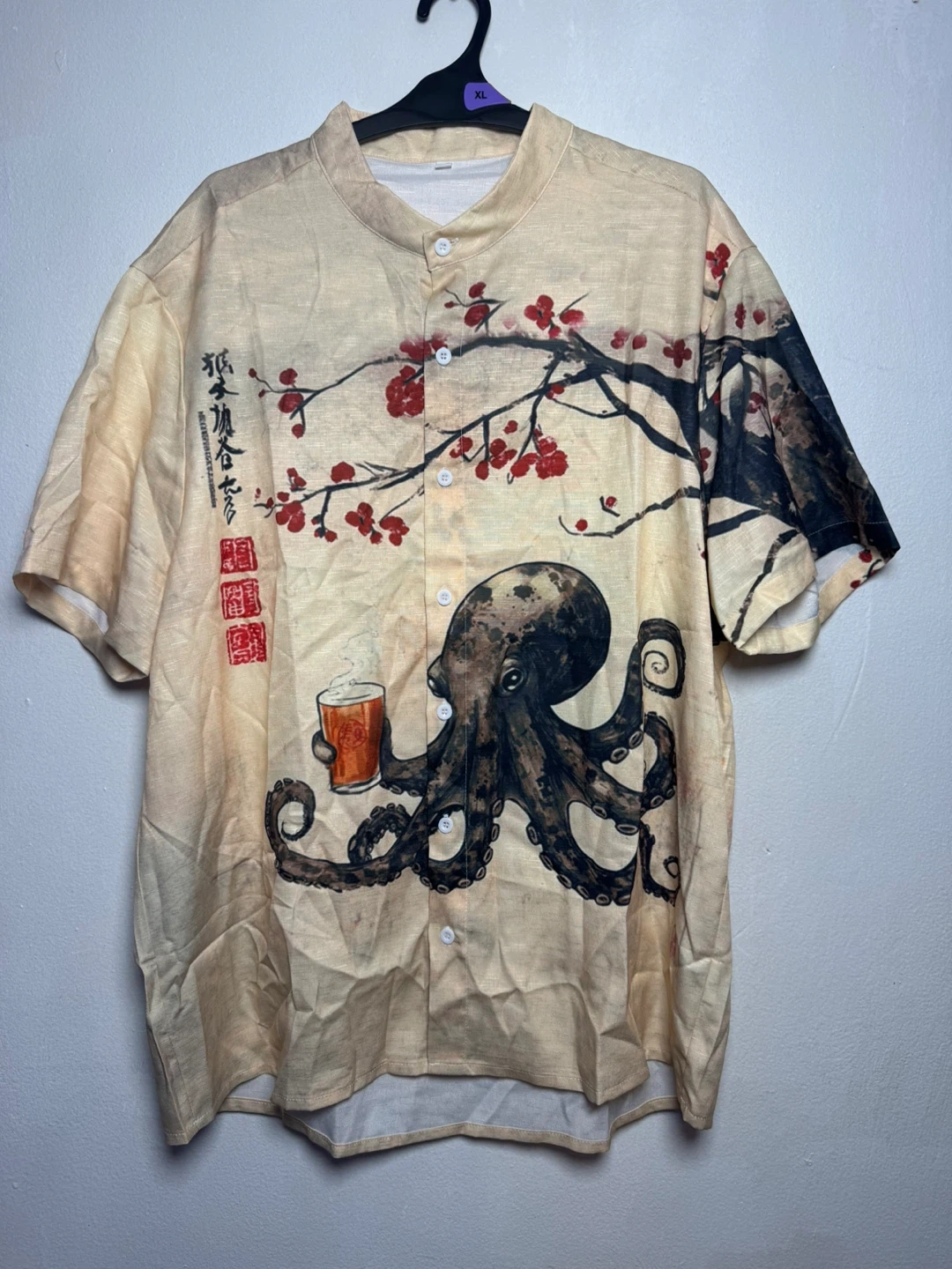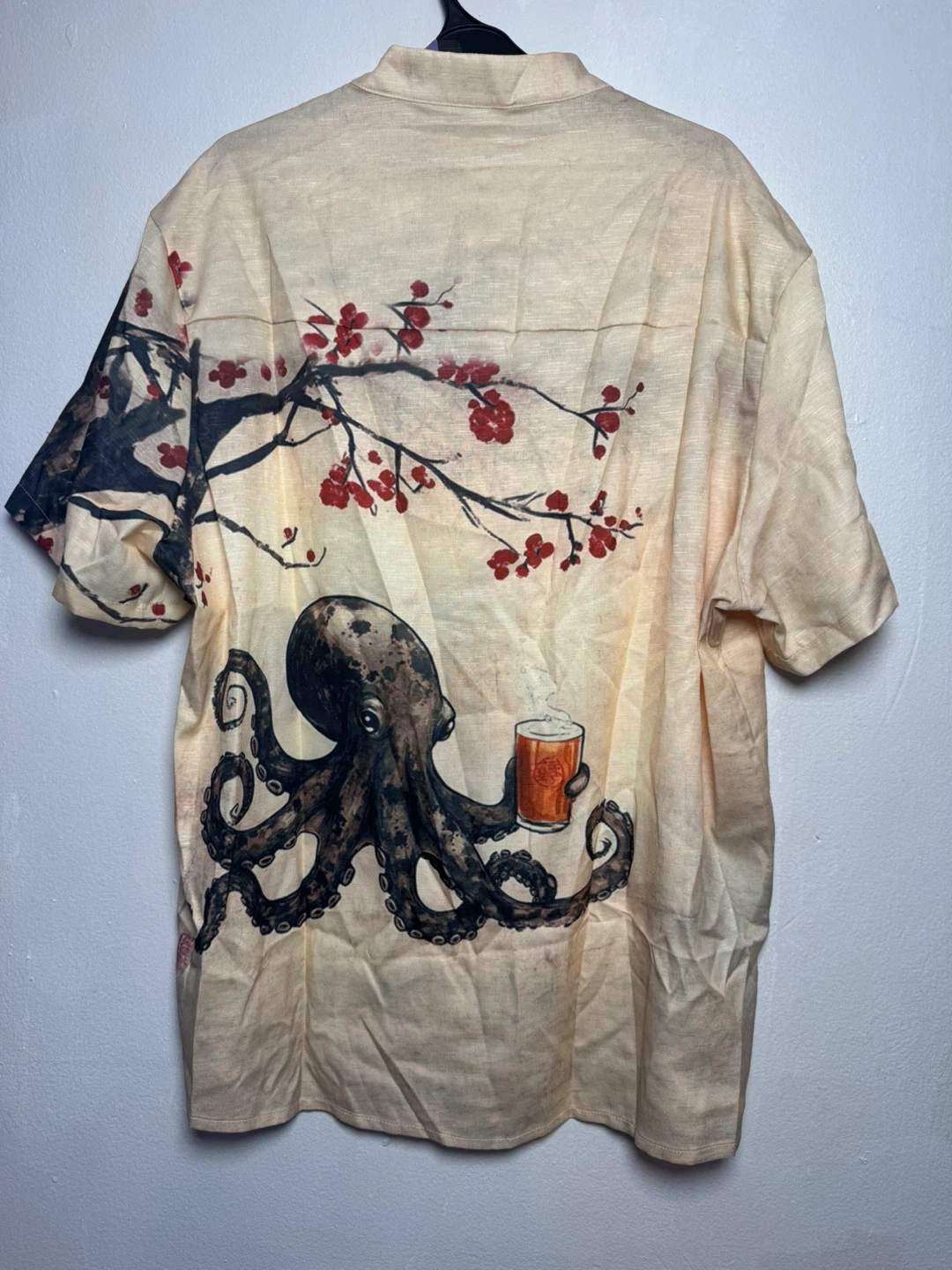 Cool short-sleeve button-up shirt with a unique octopus holding a beer graphic and cherry blossoms. Size is 3XL.