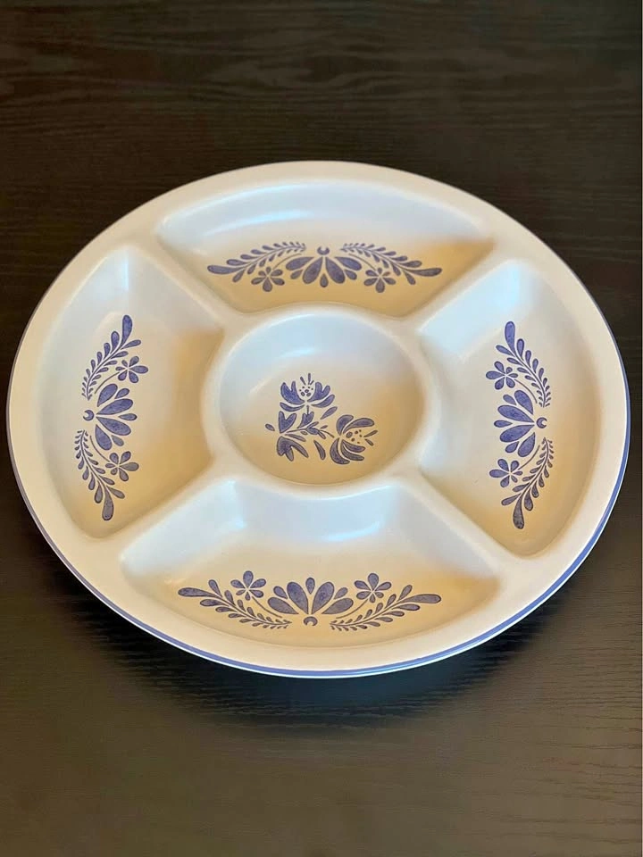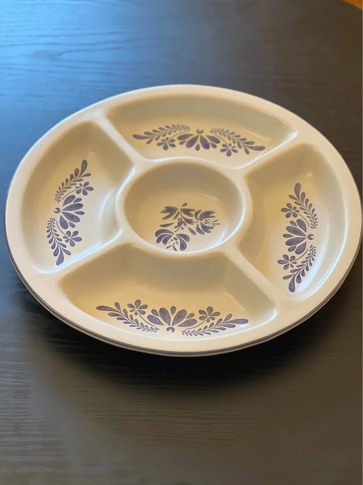 This Pfaltzgraff Yorktowne 5 Section Tray is a versatile addition to your serving collection. With its classic off white and blue pattern, the tray measures approximately 15 3/4" in diameter and stands 1 3/4" tall. The round stoneware tray is an original, showcasing the renowned Yorktowne design that is sure to complement any table setting. Crafted with care, this tray features five compartments, making it ideal for presenting a variety of appetizers. The sturdy construction weighs in at around 5 lb 3 ozs, ensuring stability during use. Whether you're hosting a dinner party or enjoying a family meal, this Pfaltzgraff server is a functional and stylish choice for your dining needs.